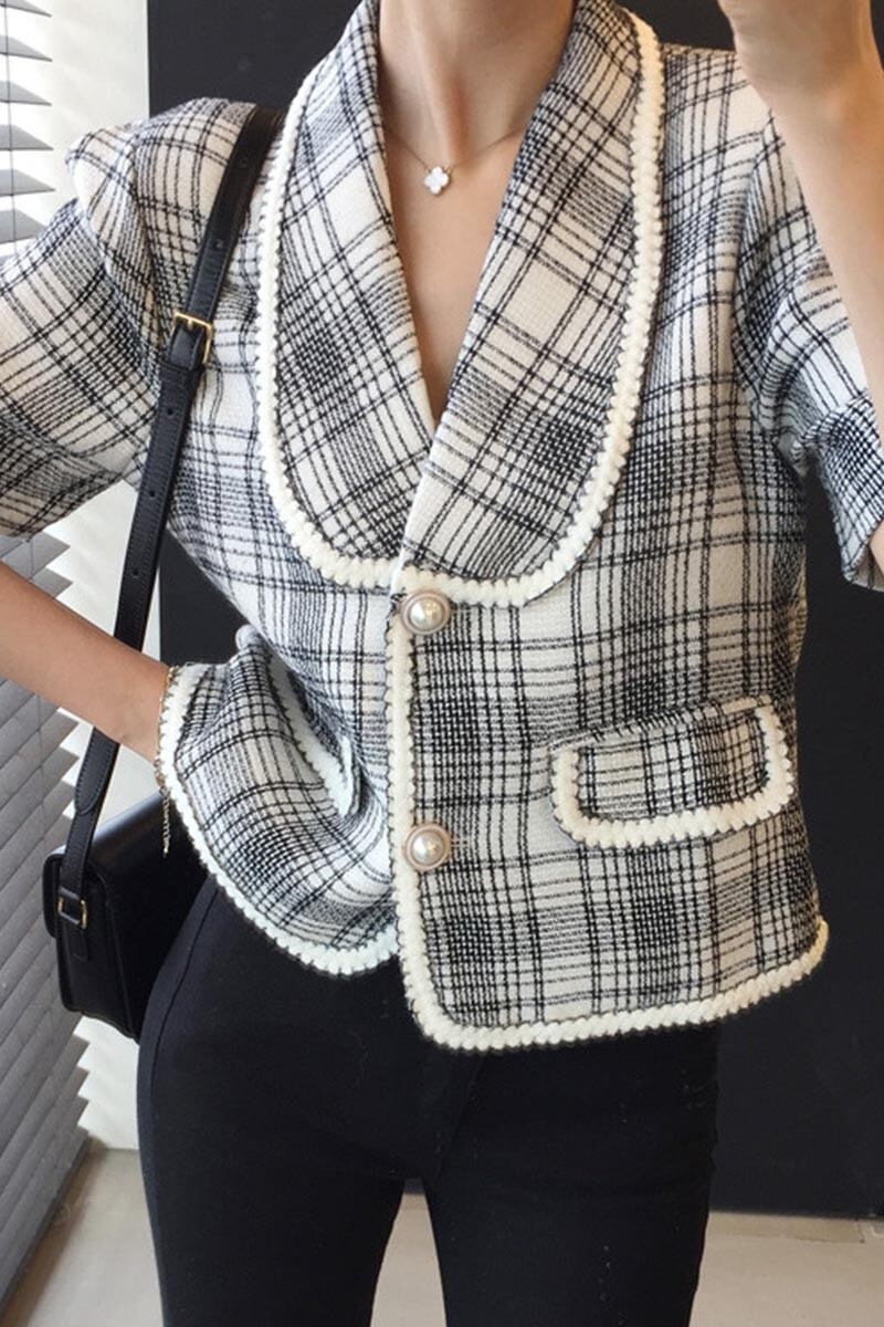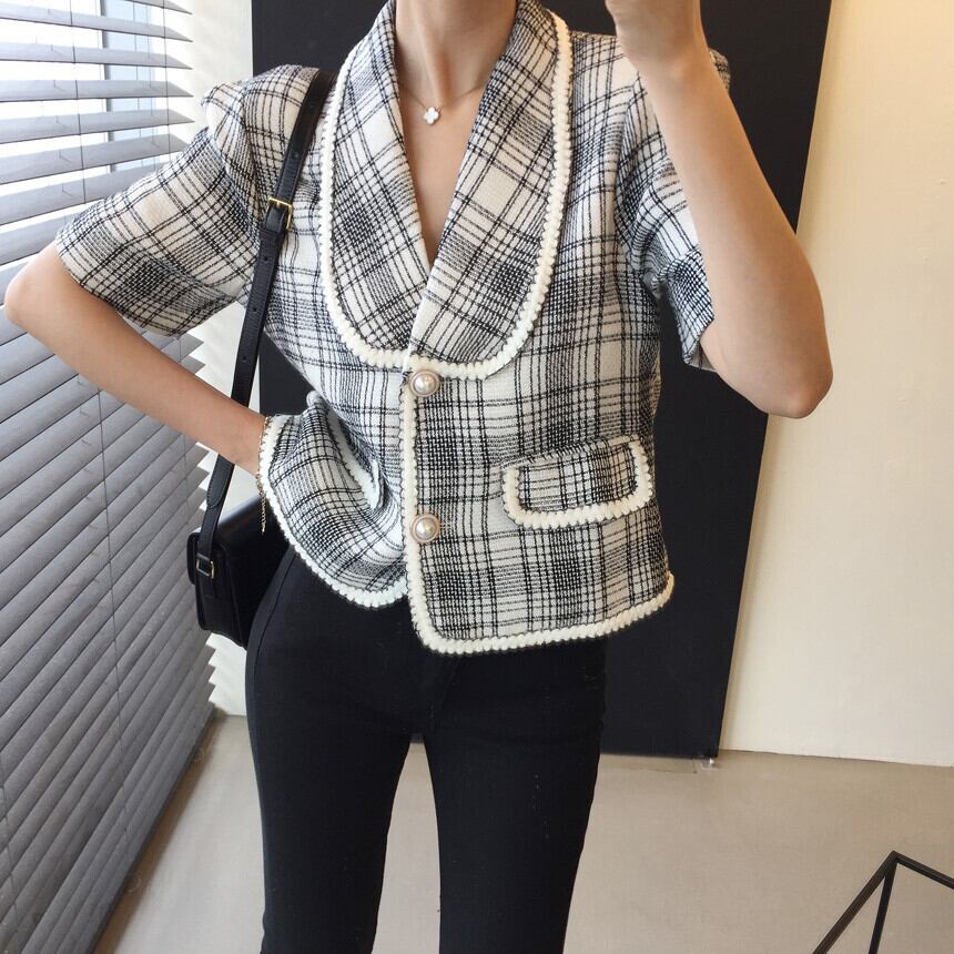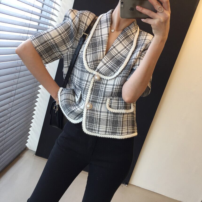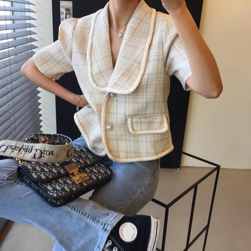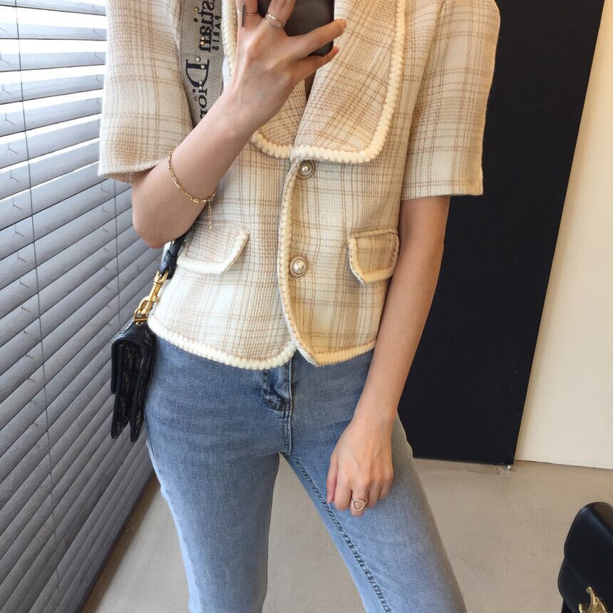 半袖ツイードジャケット アウター ジャケット 袖あり 半袖 Vネック 襟付き 前開き かわいい 大人可愛い きれいめ シンプル カジュアル 大人 上品 おしゃれ お洒落 大人可愛い 大人女子 こなれ感 ラフ キュート ガーリー 個性的 モダン 主役級 存在感 とろみ感 柄 チェック柄 春 夏 10代 20代 30代 レディース OL 通勤 学生 通学 デート お出かけ 女子会 休日 パーティー イベント 着回し 普段使い 重ね着 韓国系 オルチャン 色展開 黒 ブラック アプリコット