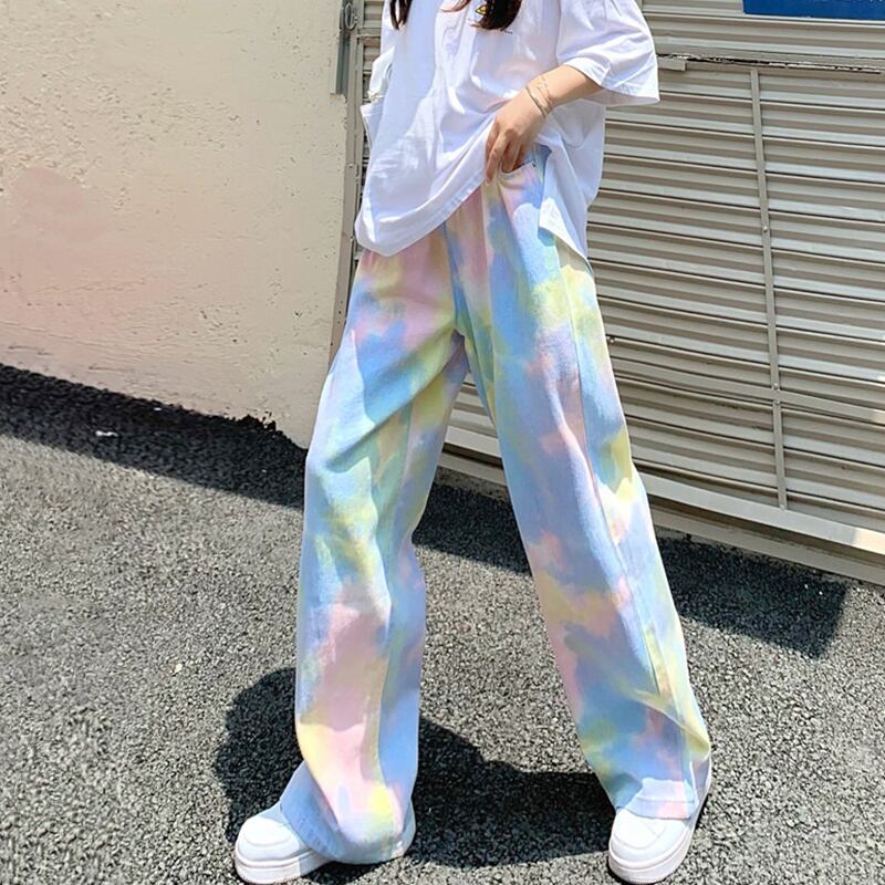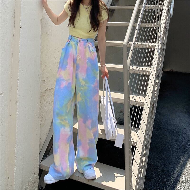 レインボー マーブル模様 ボトムス パンツ ワイドパンツ ロング丈 ワイド ハイウエスト おしゃれ お洒落 かっこいい レトロ 個性的 存在感 春 夏 10代 20代 30代 レディース 女性用 お出かけ 女子会 休日 旅行 着回し 普段使い 美脚 脚長 S M L XL