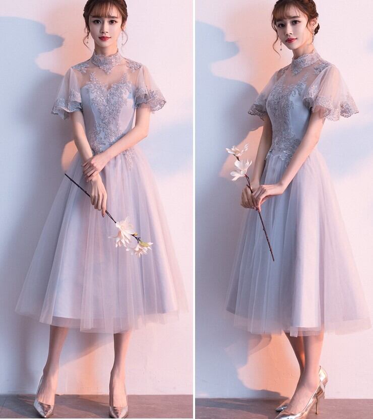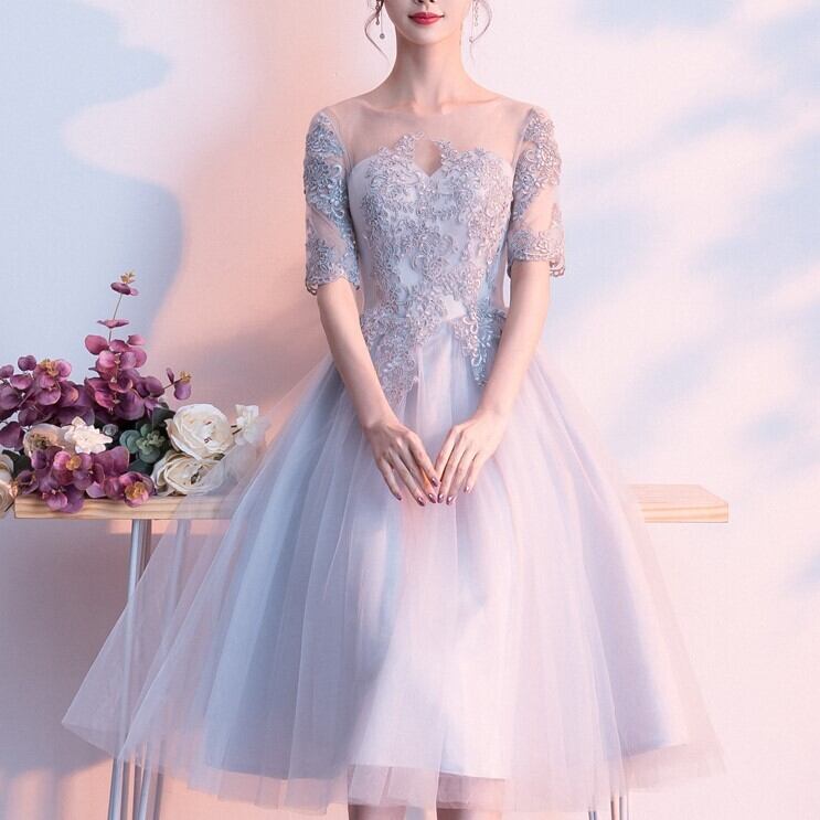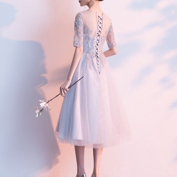 ドレス ひざ丈 膝下 袖あり 半袖 パフスリーブ フレア Aライン 切り替えデザイン 刺繍 チュール 透け感 大人可愛い きれいめ 上品 おしゃれ 大人女子 ラブリー キュート セクシー エレガント 主役級 存在感 小花柄 春 夏 2021 10代 20代 30代 レディース パーティー イベント モテ 美脚 脚長 インスタ映え サイズ S M L XL 2XL 3XL 色展開 ペールグレー