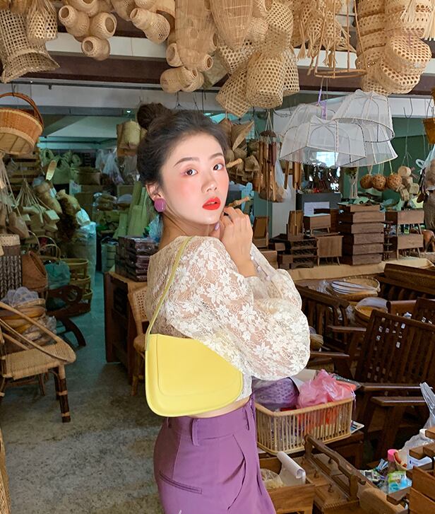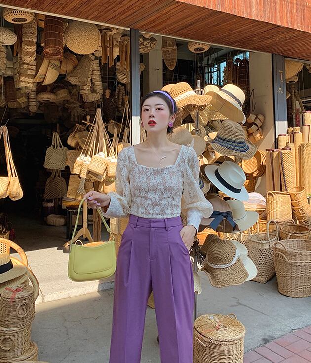 デコルテがきれいに見えるレースが印象的なブラウス。
