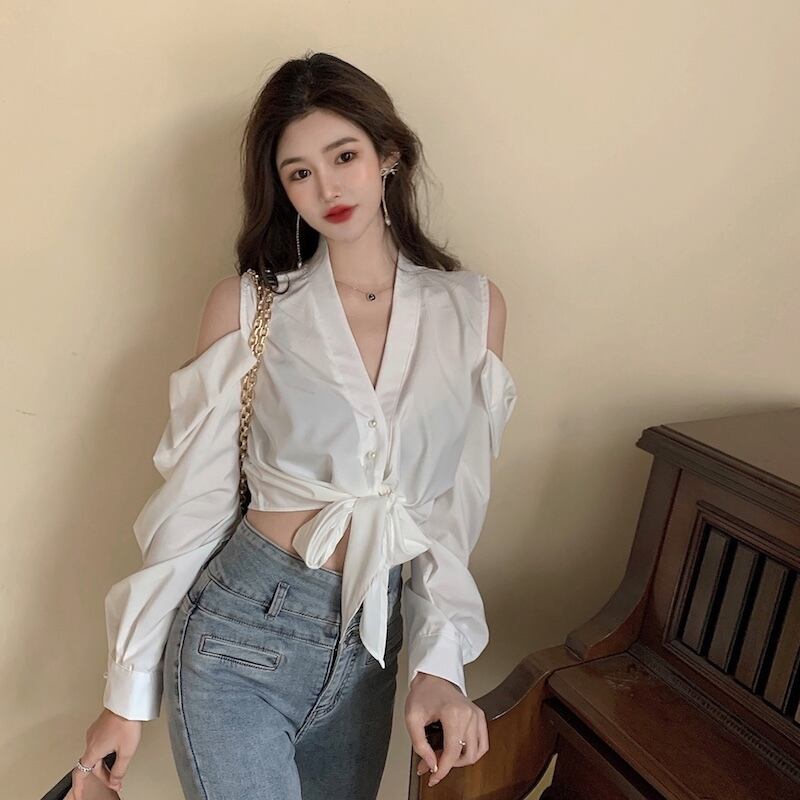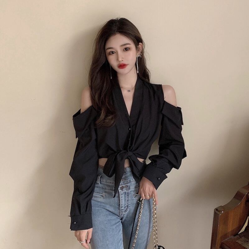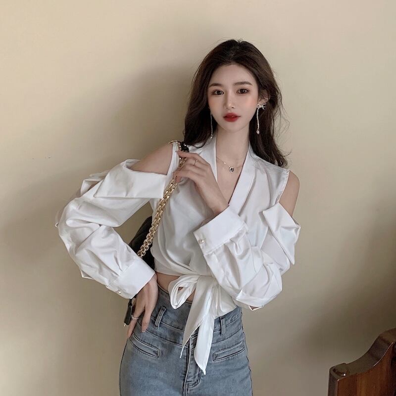 オフショルシャツ トップス シャツ ブラウス ショート ショート丈 袖あり 長袖 Vネック オフショルダー オフショル リボン 前開き かわいい 大人可愛い きれいめ シンプル カジュアル 大人 上品 おしゃれ お洒落 大人可愛い 大人女子 こなれ感 ラフ ラブリー キュート ガーリー 個性的 モダン 主役級 存在感 無地 春 秋 10代 20代 30代 レディース OL 通勤 学生 通学 デート お出かけ 女子会 休日 着回し 普段使い 重ね着 韓国系 オルチャン 色展開 白 ホワイト 黒 ブラック