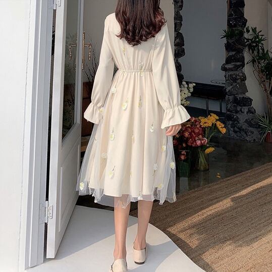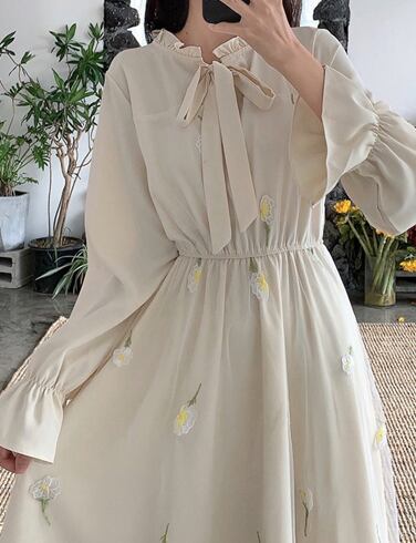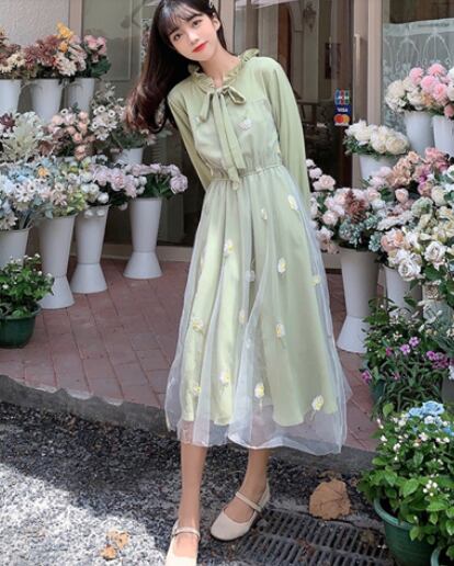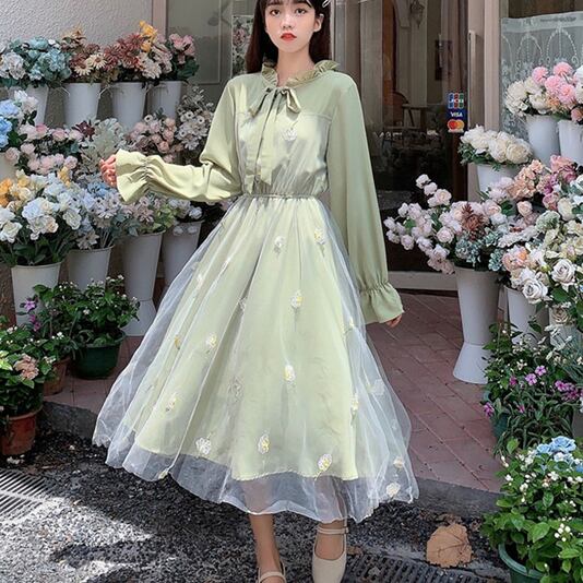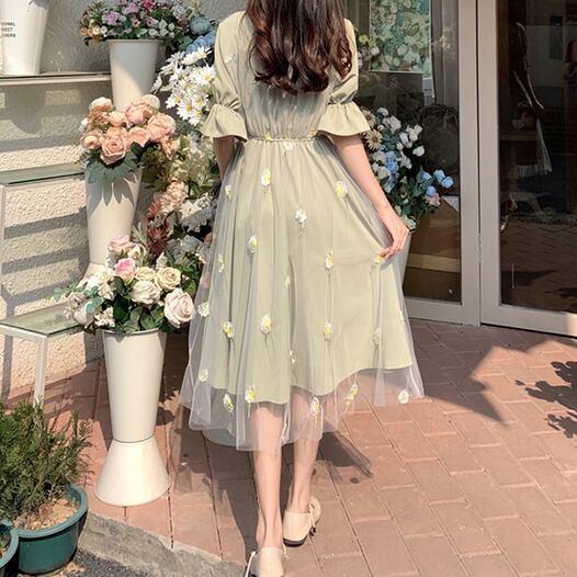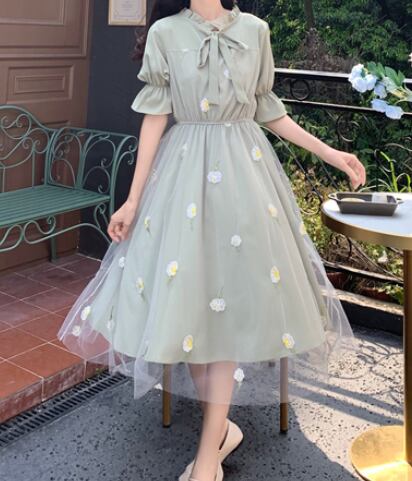 ワンピース ドレス ワンピドレス ひざ丈 袖あり 半袖 長袖 パフスリーブ ラウンドネック フレア Aライン チュール フリル リボン ハイウエスト 透け感 かわいい 大人可愛い 上品 おしゃれ ラブリー キュート ガーリー エレガント 存在感 とろみ感 小花柄 シーズンレス 2022 10代 20代 レディース 学生 デート お出かけ 女子会 休日 パーティー イベント ホテル レストラン 着回し 普段使い モテ 美脚 新作 インスタ映え フレンチスタイル サイズ S M L グリーン アプリコット