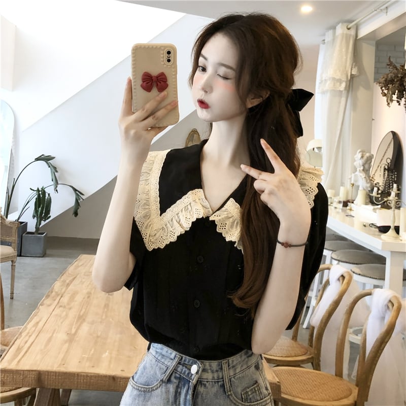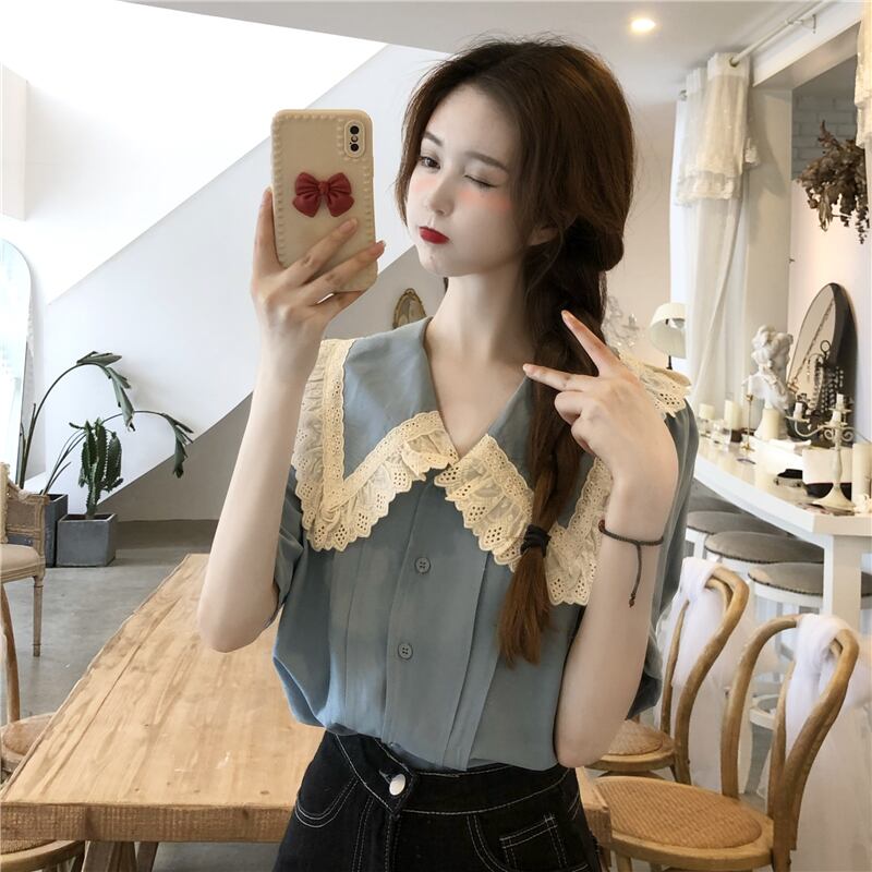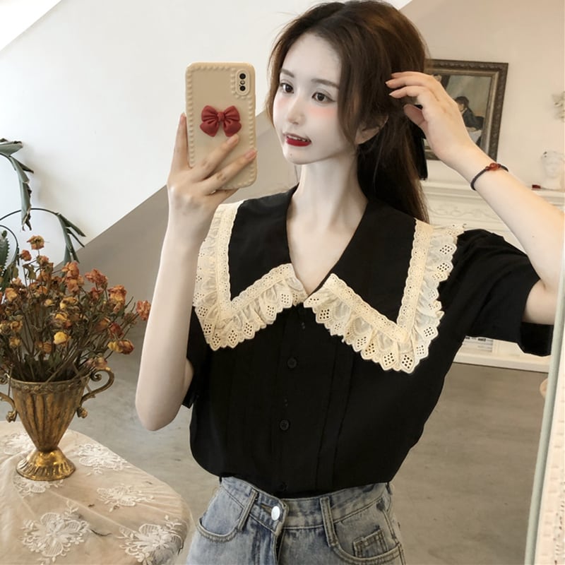 レース衿ブラウス トップス ブラウス 袖あり 半袖 襟付き レース 前開き かわいい 大人可愛い きれいめ シンプル カジュアル 大人 上品 おしゃれ お洒落 大人可愛い 大人女子 こなれ感 ラフ ラブリー キュート ガーリー モダン 主役級 存在感 無地 春 夏 10代 20代 30代 レディース OL 通勤 学生 通学 デート お出かけ 女子会 休日 着回し 普段使い 重ね着 サイズ L XL 2XL 3XL 4XL 色展開 黒 ブラック 青 ブルー