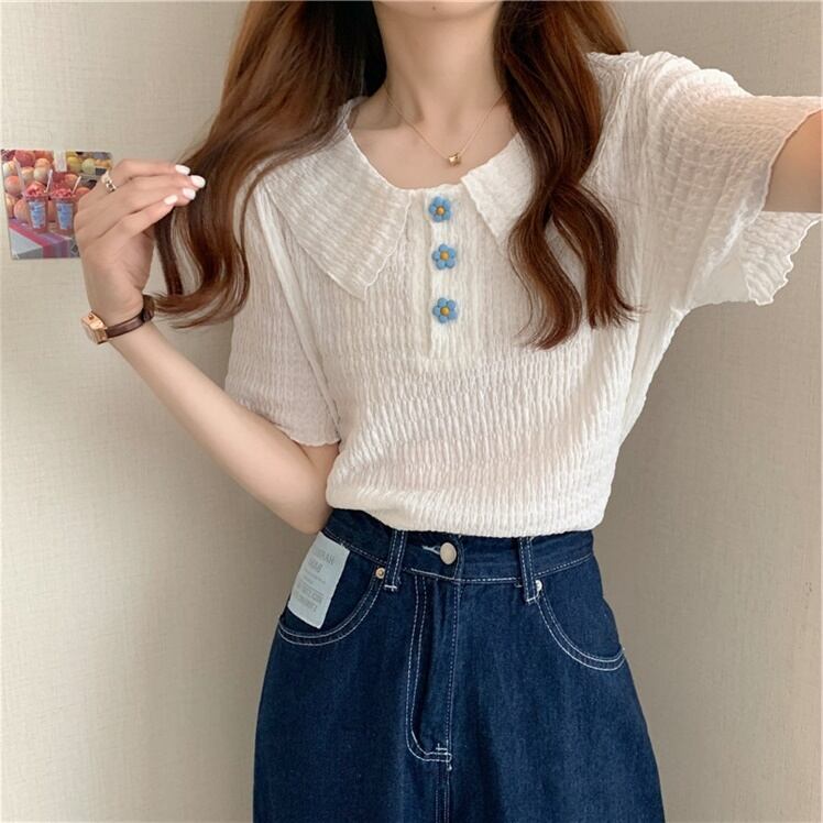 キュートなフラワーボタンがアクセントの襟付きトップス。