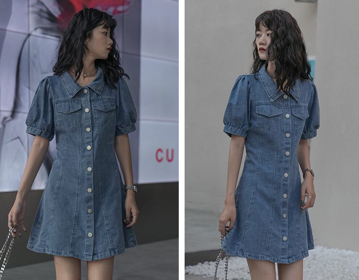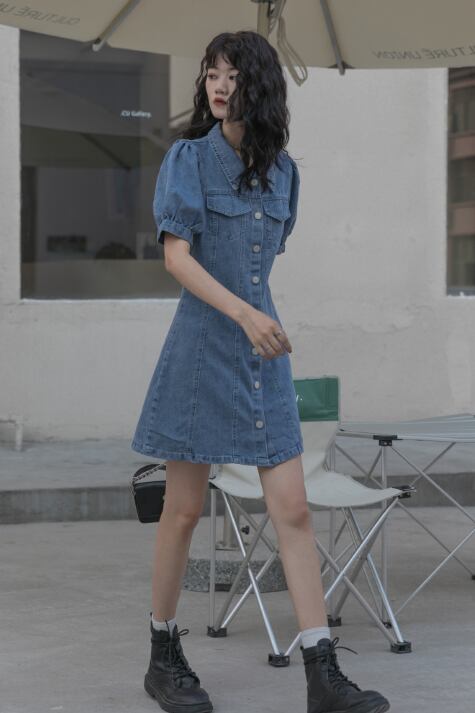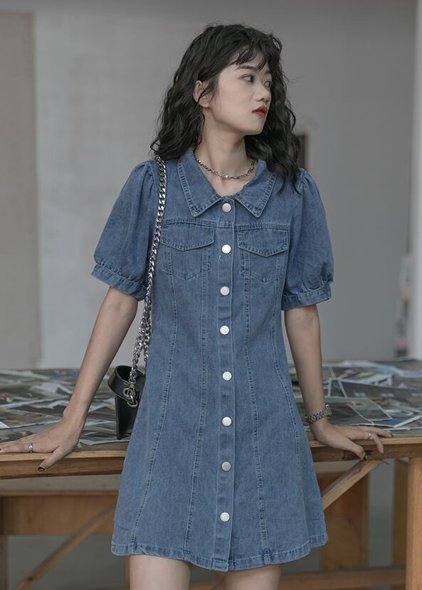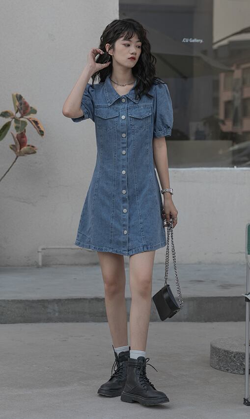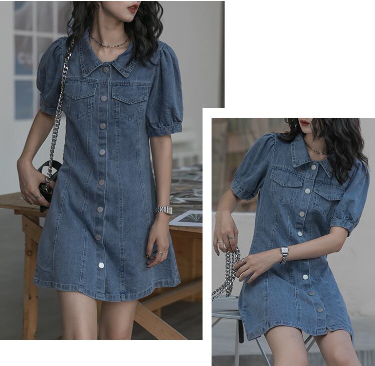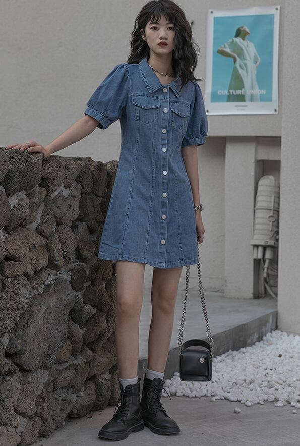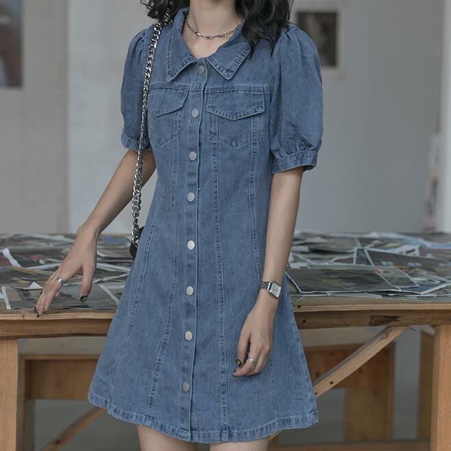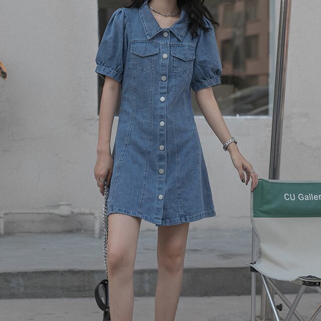 デニムワンピース ワンピース フレアワンピース ミニ ミニ丈 袖あり 半袖 パフスリーブ Vネック 襟付き フレア ハイウエスト 前開き デニム かわいい 大人可愛い きれいめ シンプル カジュアル 大人 上品 おしゃれ お洒落 大人可愛い 大人女子 こなれ感 ラフ ラブリー キュート ガーリー モダン 主役級 存在感 無地 春 夏 10代 20代 30代 レディース 学生 通学 デート お出かけ 女子会 休日 着回し 普段使い 重ね着 韓国系 オルチャン サイズ S M L 色展開 青 ブルー