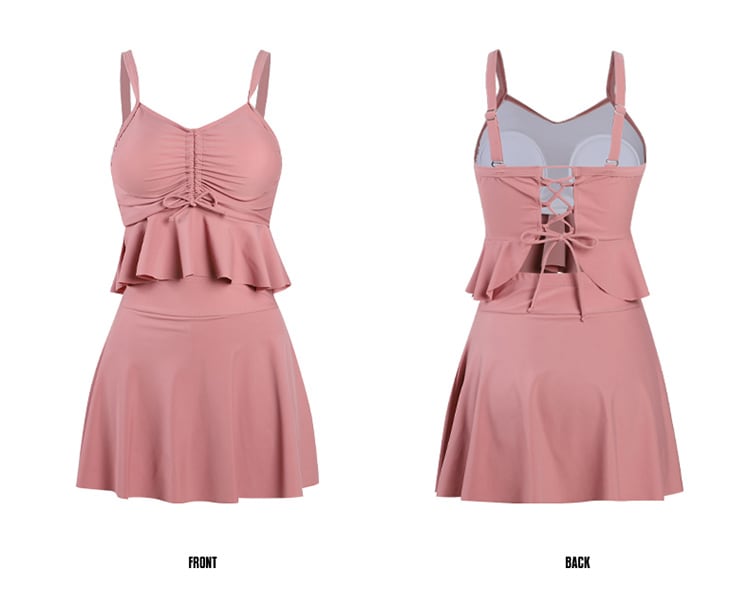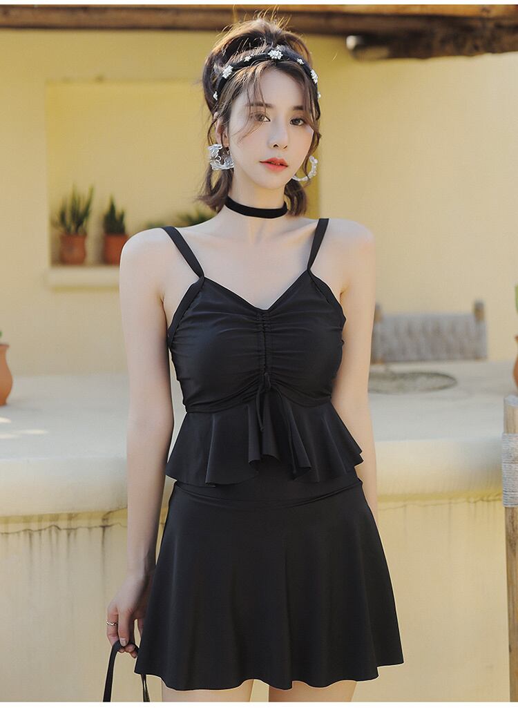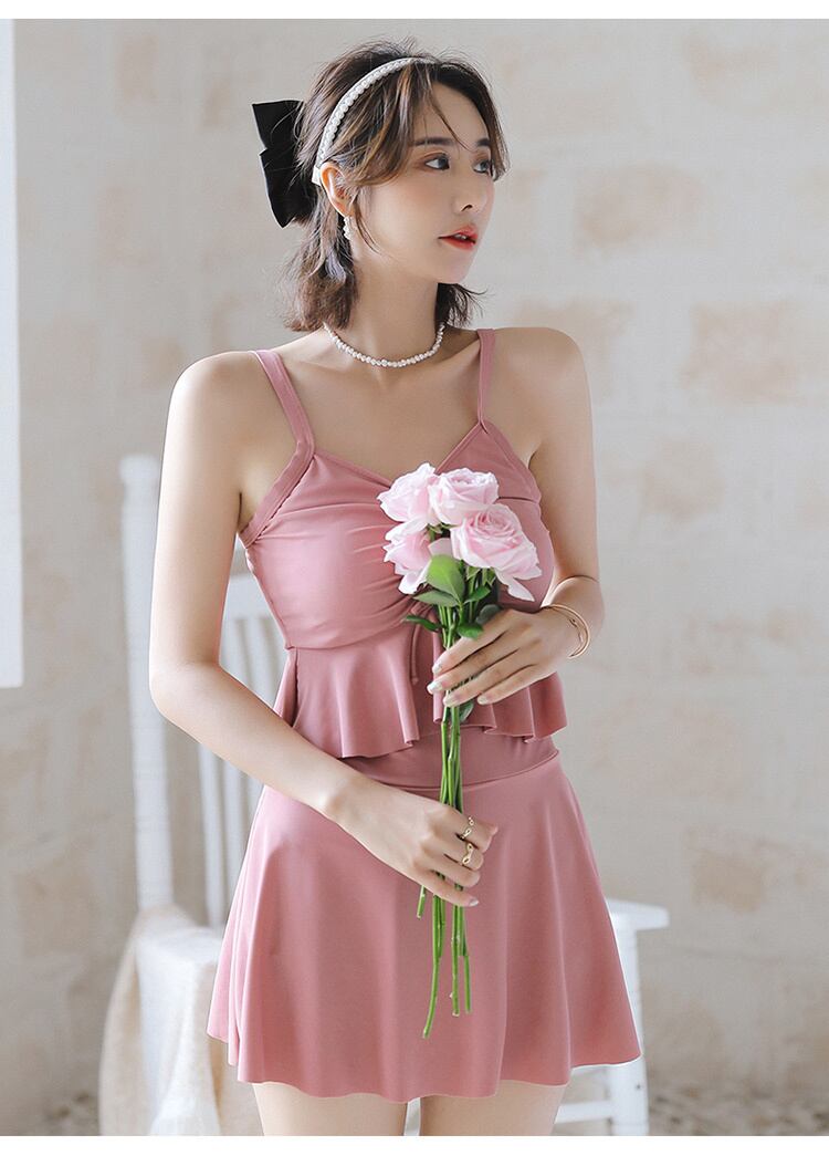 フレアスカートとフリルが女性らしさを醸し出します。