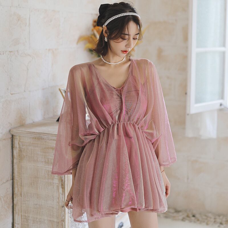 透け感のワンピースがキュートなビキニ水着の3点セット。