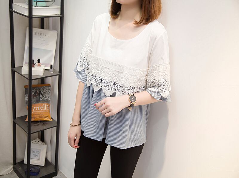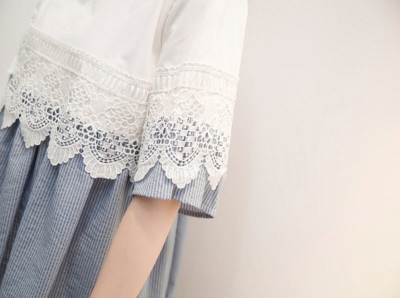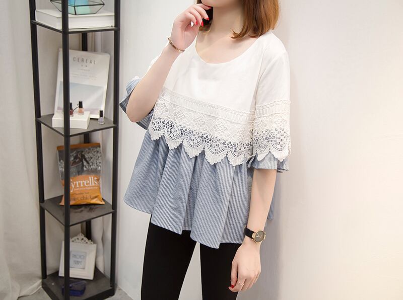 トップス シャツ ブラウス 袖あり 5分袖 五分袖 ラウンドネック ストレート 切り替えデザイン ドッキング レース 綿 かわいい カジュアル おしゃれ お洒落 大人可愛い 大人女子 ストライプ 夏 10代 20代 30代 40代 レディース 女性用 ママ デート お出かけ 休日 旅行 着回し 普段使い 楽ちん モテ 体型カバー XL 2XL 3XL ゆったり 青 ブルー