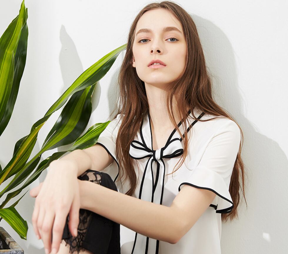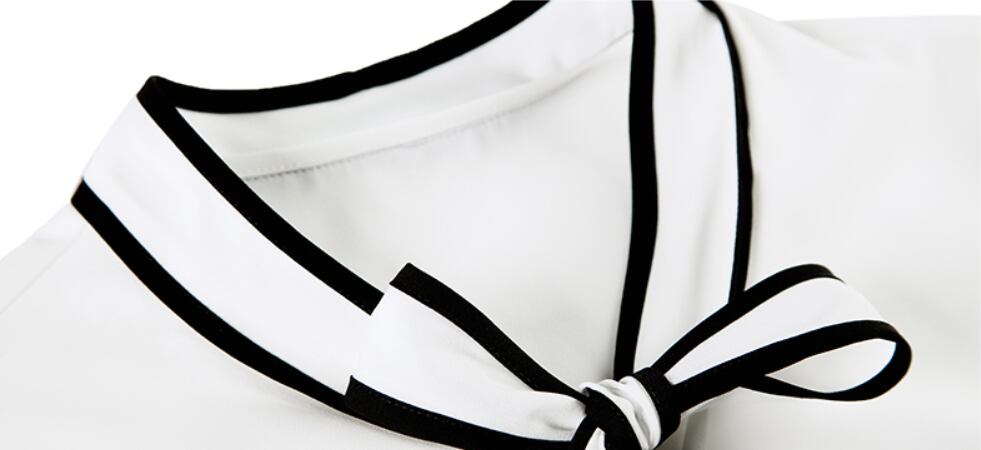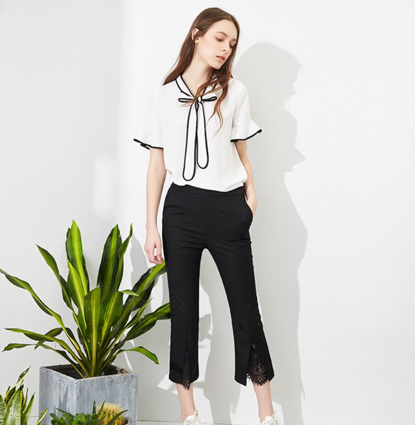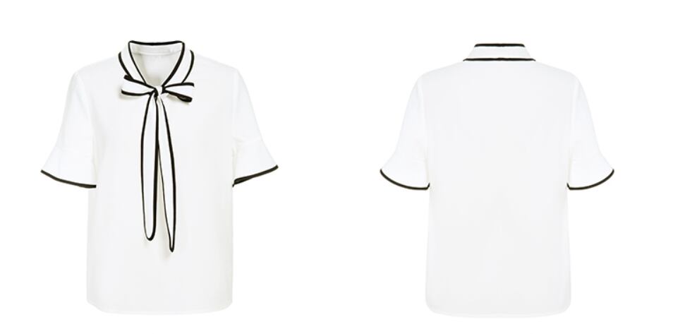 フロントリボンとフレア袖がおしゃれなシフォンブラウス。