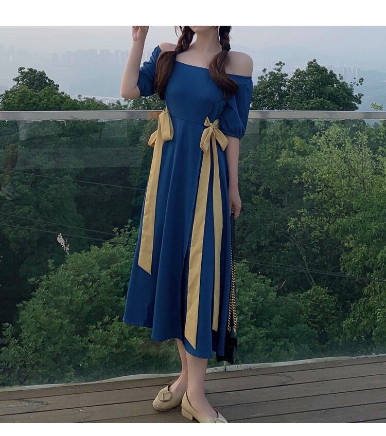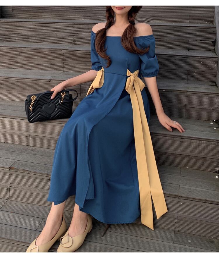 バイカラーフレアワンピース ワンピース フレアワンピース ミモレ ミモレ丈 ロング ロング丈 袖あり 半袖 オフショルダー オフショル フレア Aライン リボン ハイウエスト かわいい 大人可愛い きれいめ シンプル カジュアル 大人 上品 おしゃれ お洒落 大人可愛い 大人女子 こなれ感 ラフ キュート ガーリー 個性的 エレガント モダン 主役級 存在感 とろみ感 無地 春 夏 10代 20代 30代 レディース 学生 通学 デート お出かけ 公園デビュー 女子会 休日 着回し 普段使い 重ね着 韓国