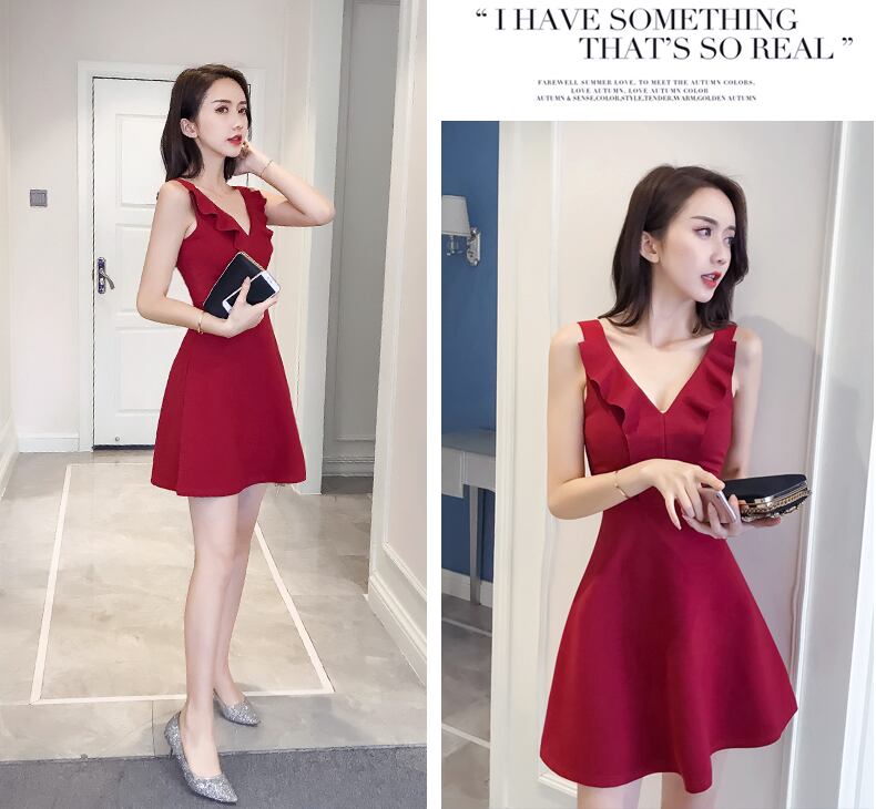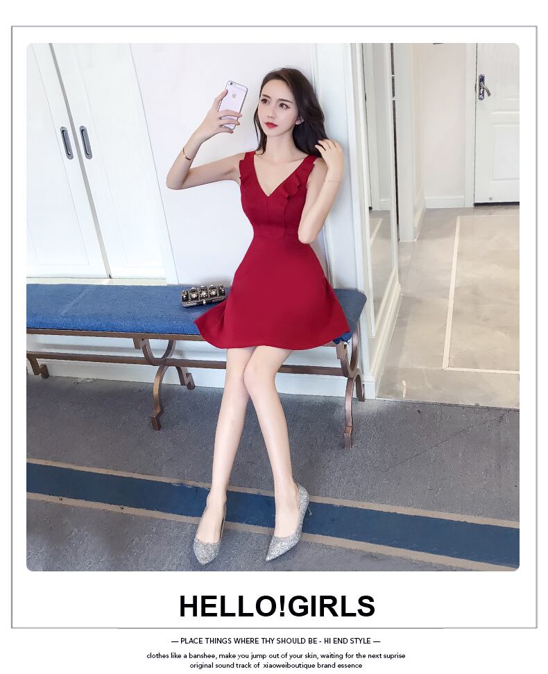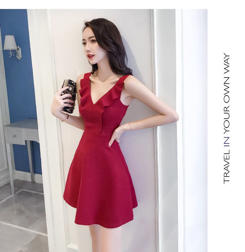 ワンピース ミニ丈 袖なし ノースリーブ Vネック Aライン フリル ウエストマーク バックコンシャス ファスナー ハイウエスト シンプル レトロ セクシー 無地 春 夏 秋 10代 20代 レディース 女性用 デート お出かけ 女子会 休日 普段使い S M L 黒 ブラック 赤 レッド