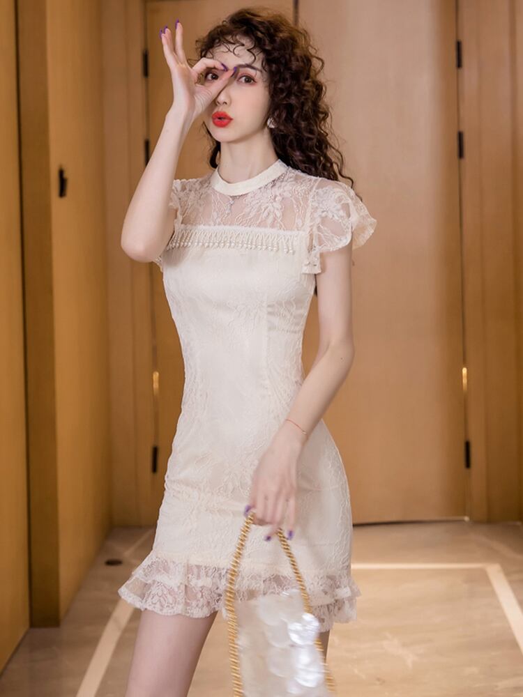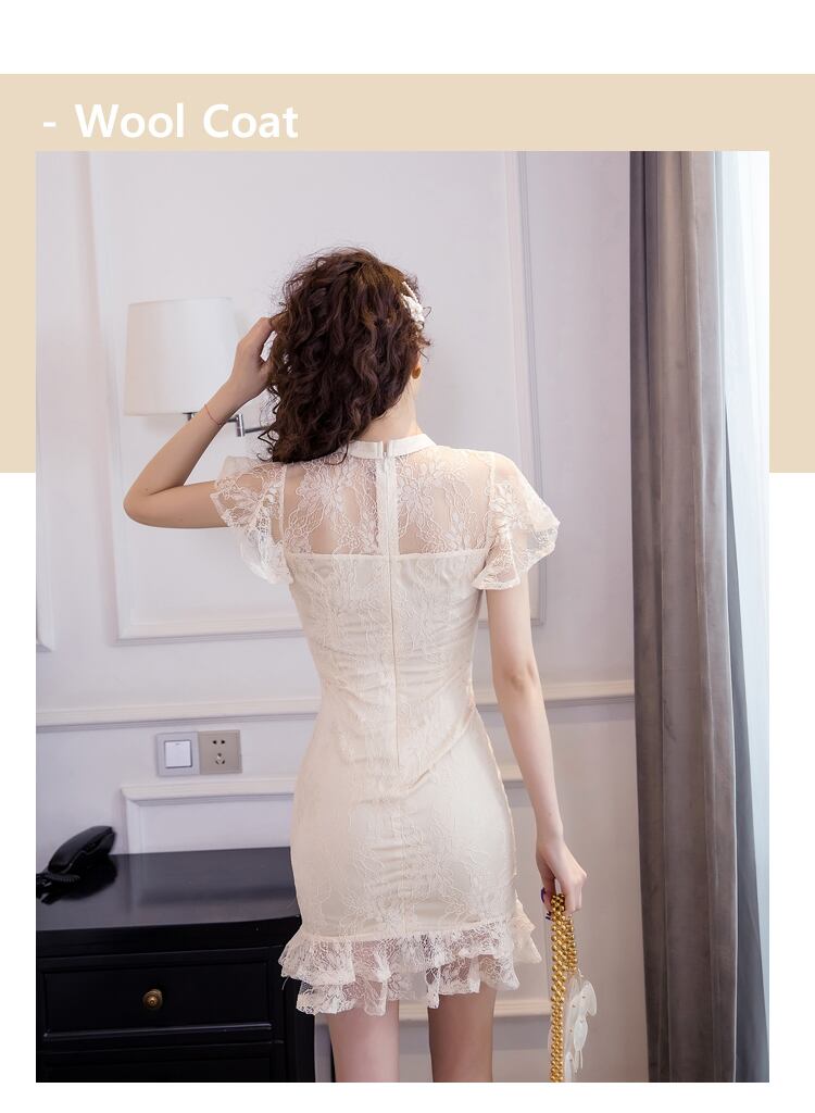 ワンピース ミニ丈 袖あり 半袖 萌袖 袖コンシャス ラウンドネック スリム タイト 細身 切り替えデザイン レース フリル ファスナー かわいい 上品 おしゃれ お洒落 大人可愛い 存在感 無地 夏 2022 10代 20代 レディース 女性用 デート お出かけ 女子会 休日 パーティー 普段使い モテ XL