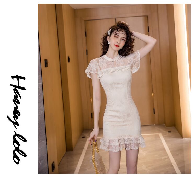 ボディラインに沿ったシルエットとレースがフェミニンなミニワンピース。