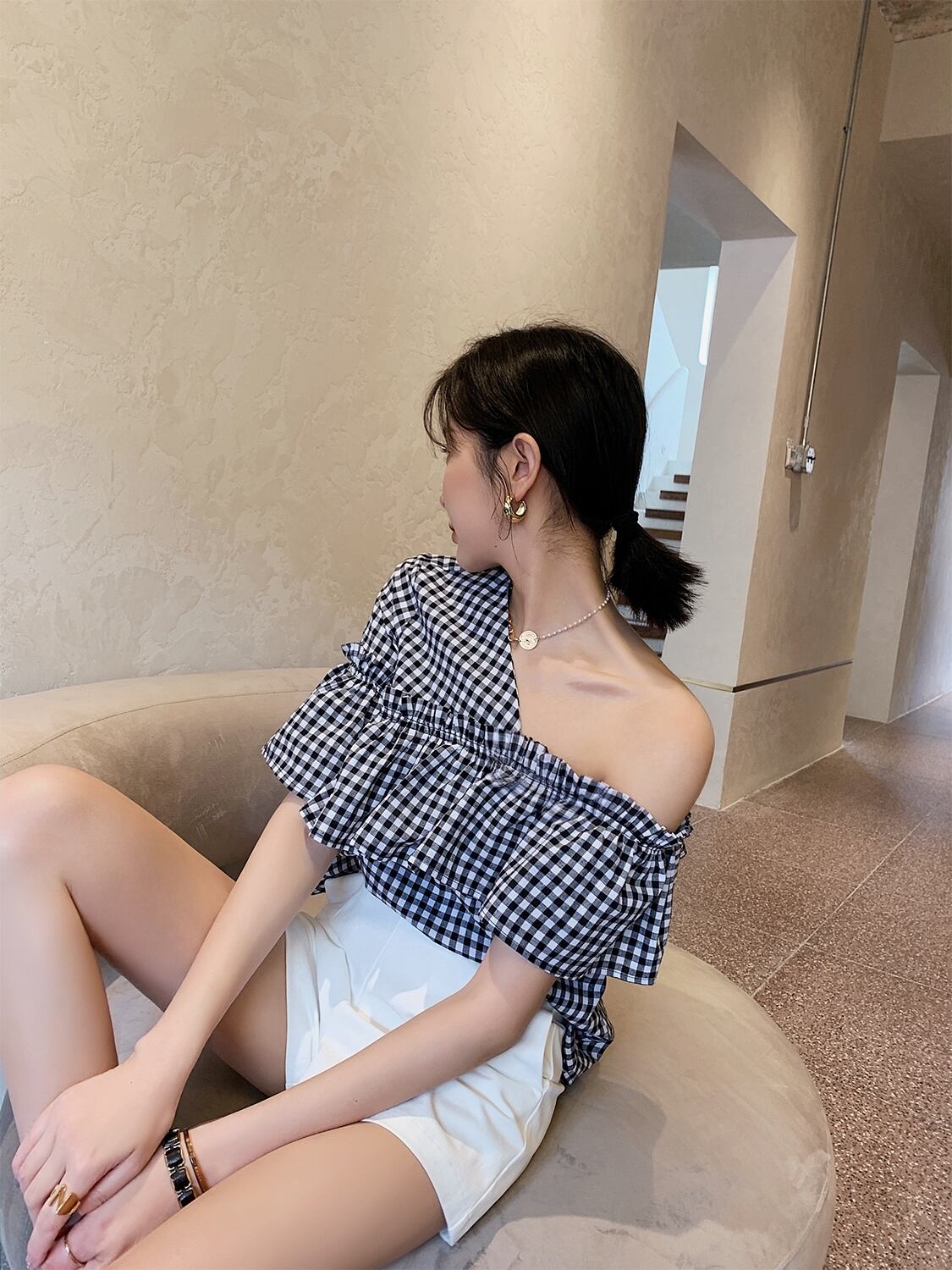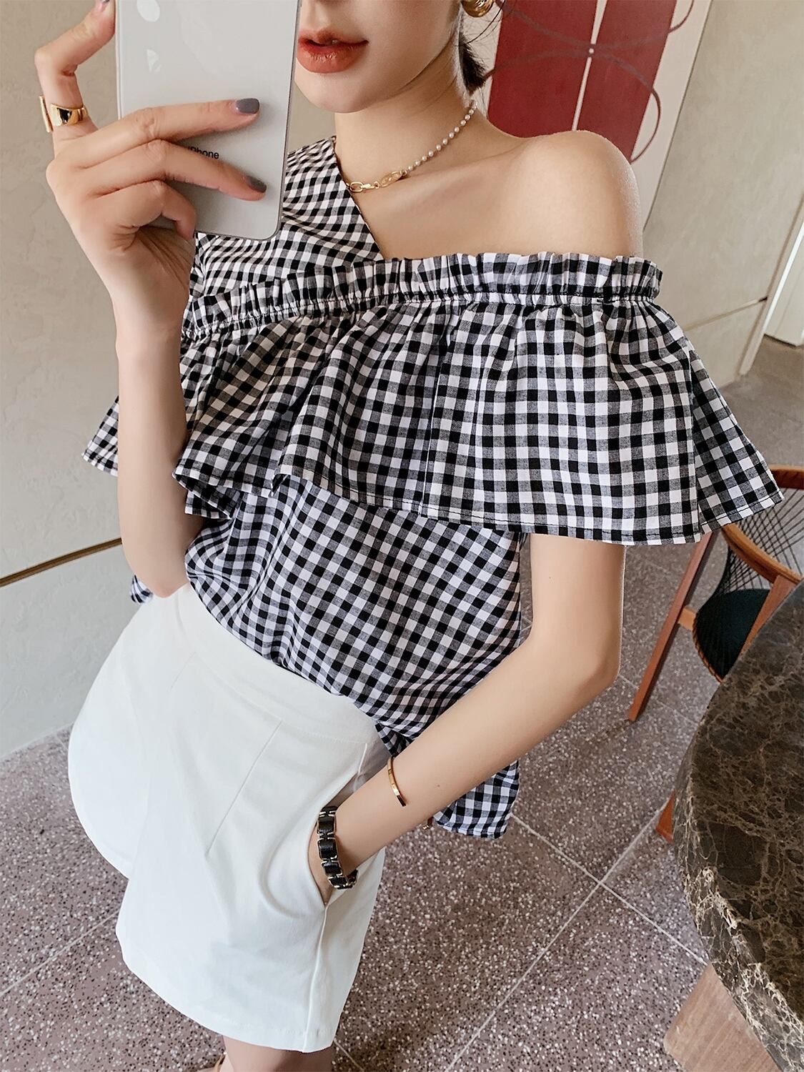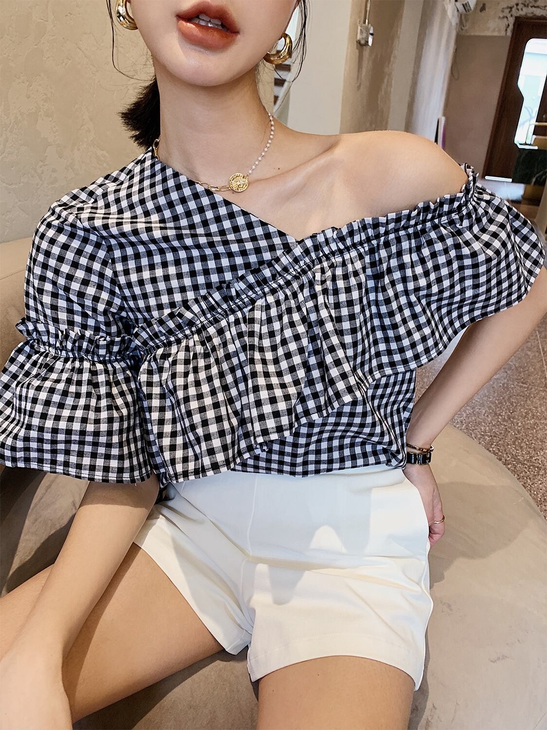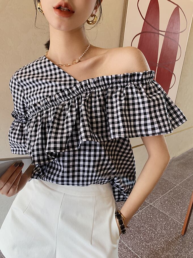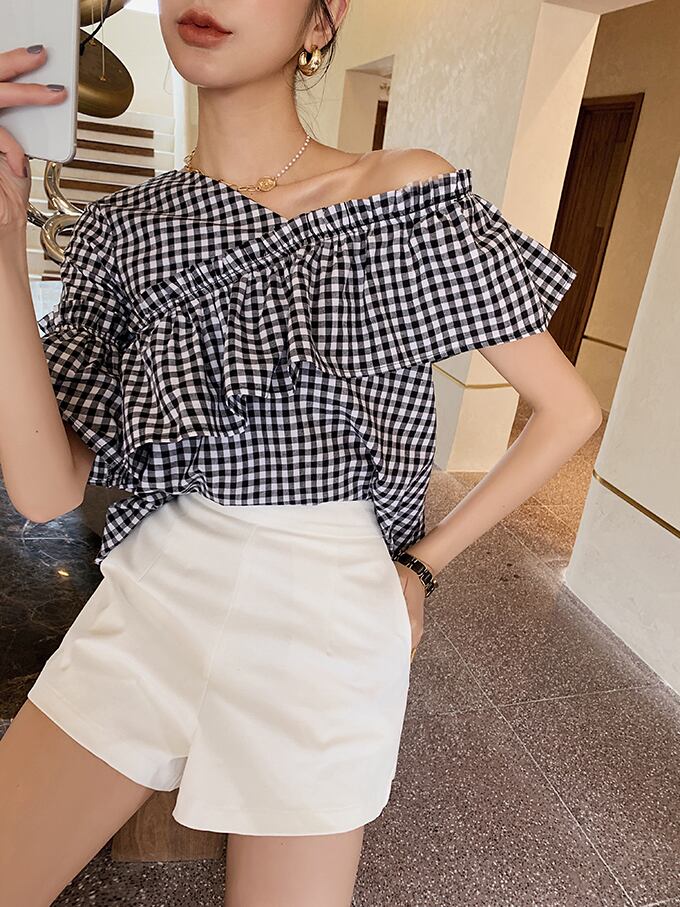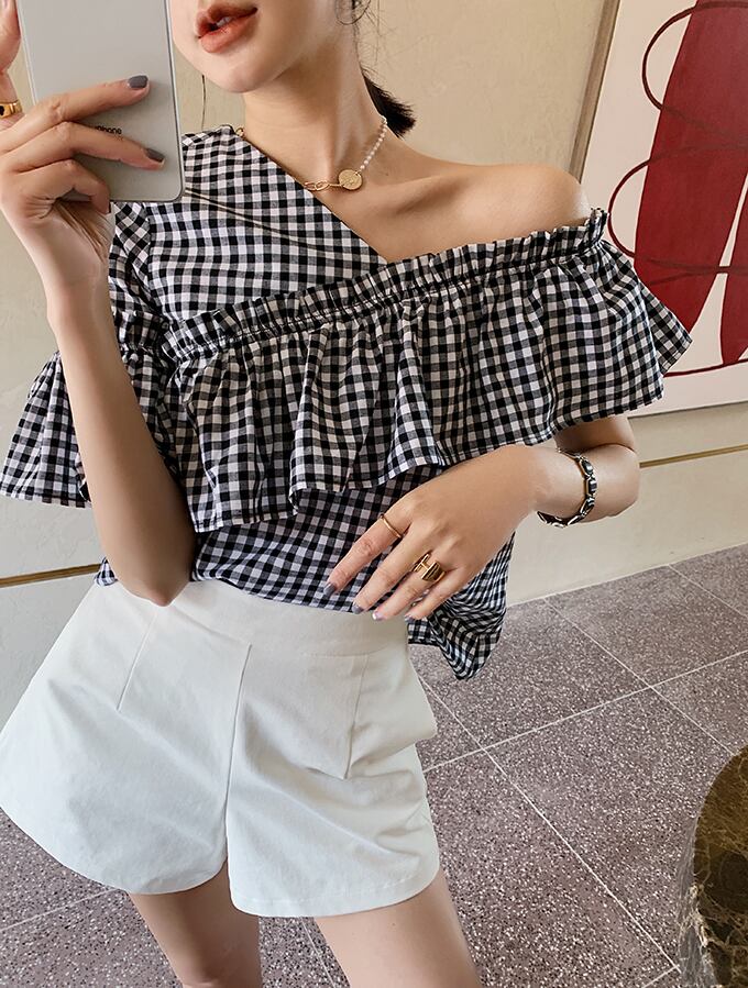 ワンショルブラウス トップス ブラウス 袖あり 半袖 ワンショルダー ワンショル フリル かわいい 大人可愛い きれいめ シンプル カジュアル 大人 上品 おしゃれ お洒落 大人可愛い 大人女子 こなれ感 ラフ キュート ガーリー 個性的 主役級 存在感 無地 柄 チェック柄 春 夏 10代 20代 30代 レディース 学生 通学 デート お出かけ 公園デビュー 女子会 休日 着回し 普段使い 重ね着 韓国系 オルチャン サイズ S M L 色展開 白 ホワイト 黒 ブラック