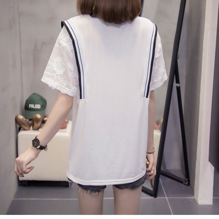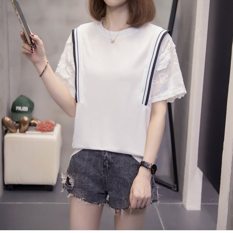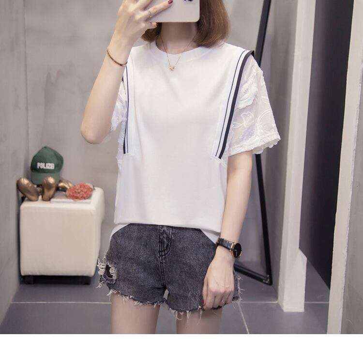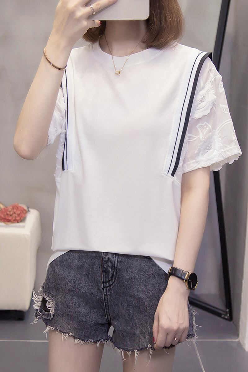 袖部分の花柄のレース仕様がとても可愛い、白色の清潔感溢れるトップス。