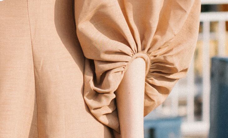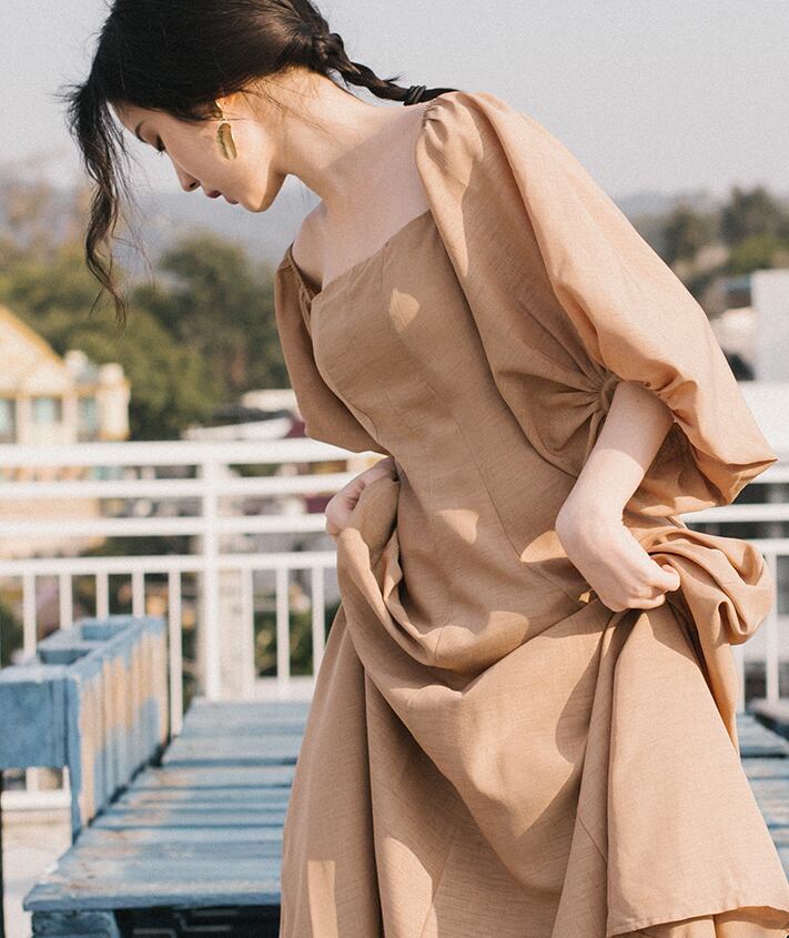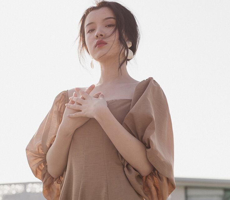 大胆なボリュームスリーブと後ろ姿のヘルシーな抜け感をポイントに、1着で存在感のある装いが叶います。