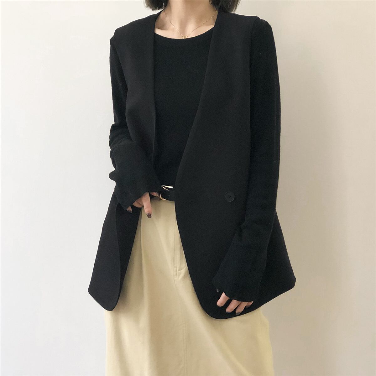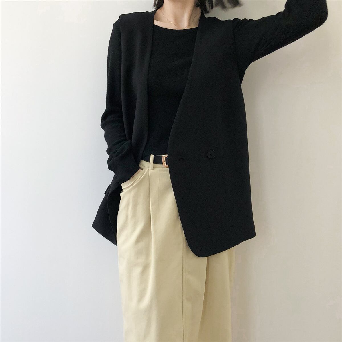 ダブルタイプのノーカラーシルエットは、羽織るだけで季節感のあるスタイルに。