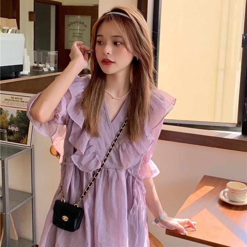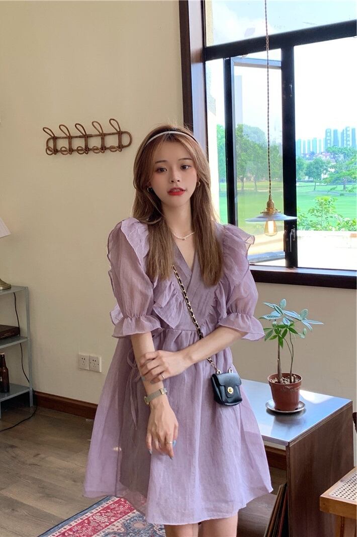 フリルワンピース ワンピース フレアワンピース ワンピドレス ミニ ミニ丈 袖あり 5分袖 五分袖 Vネック フレア フリル リボン ハイウエスト 透け感 かわいい 大人可愛い きれいめ シンプル カジュアル 大人 上品 おしゃれ お洒落 大人可愛い 大人女子 こなれ感 キュート ガーリー エレガント モダン 主役級 存在感 無地 春 夏 10代 20代 30代 レディース 学生 通学 デート お出かけ 女子会 休日 着回し 普段使い 重ね着 サイズ S M L XL 2XL 3XL 4XL パープル