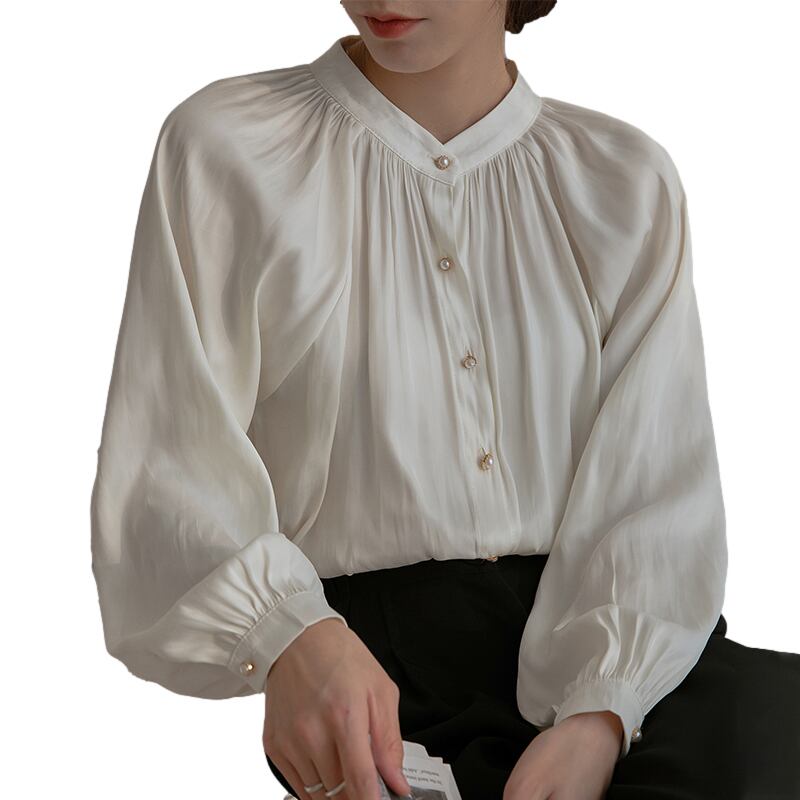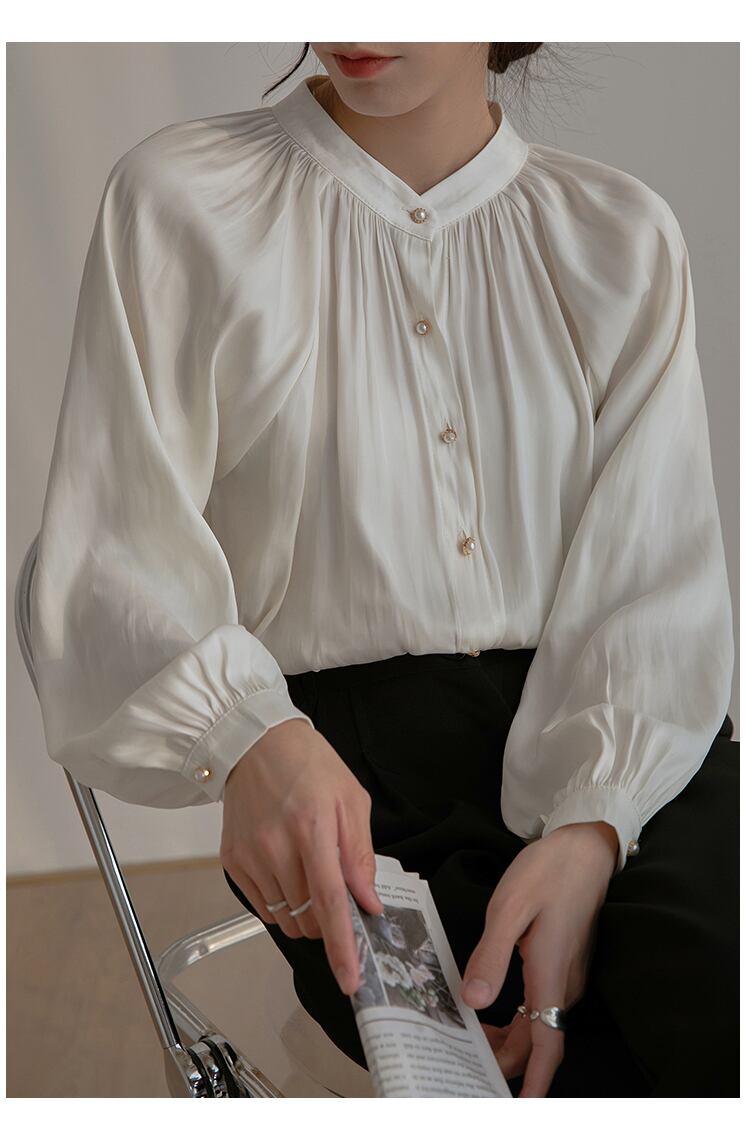 光沢感のある素材感と美しいギャザードレープが高級感あるブラウスです。