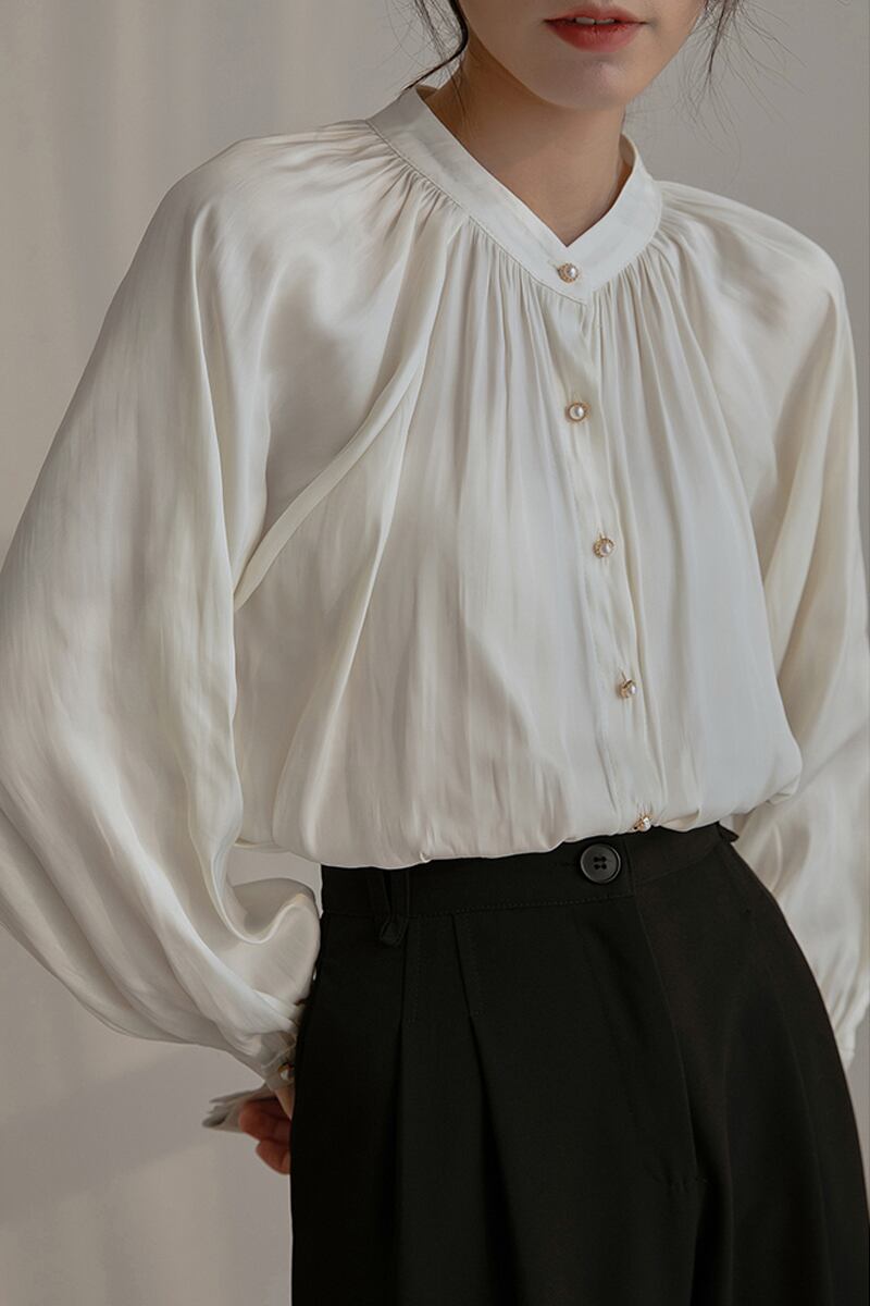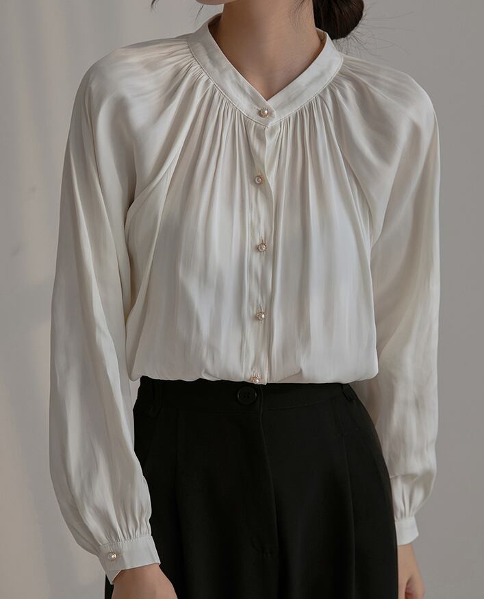 シンプルなデザインのノーカラーブラウス。