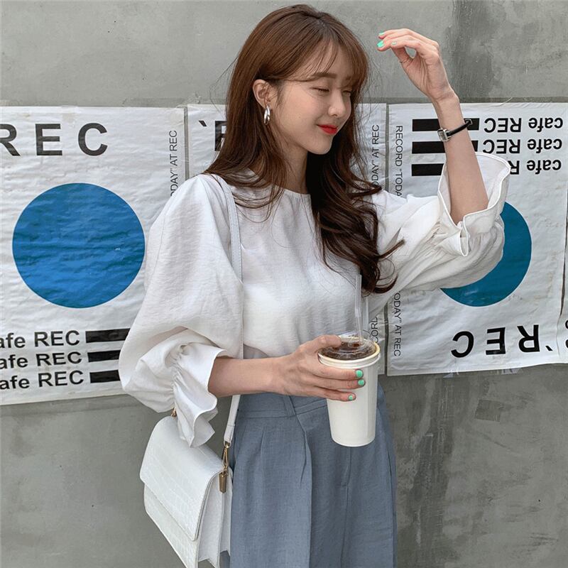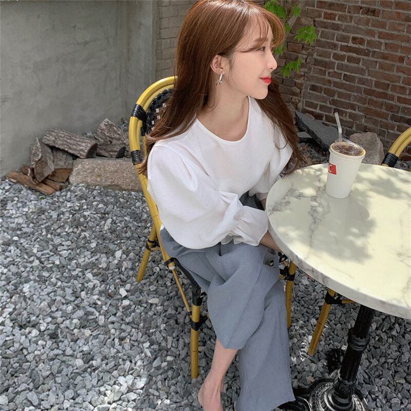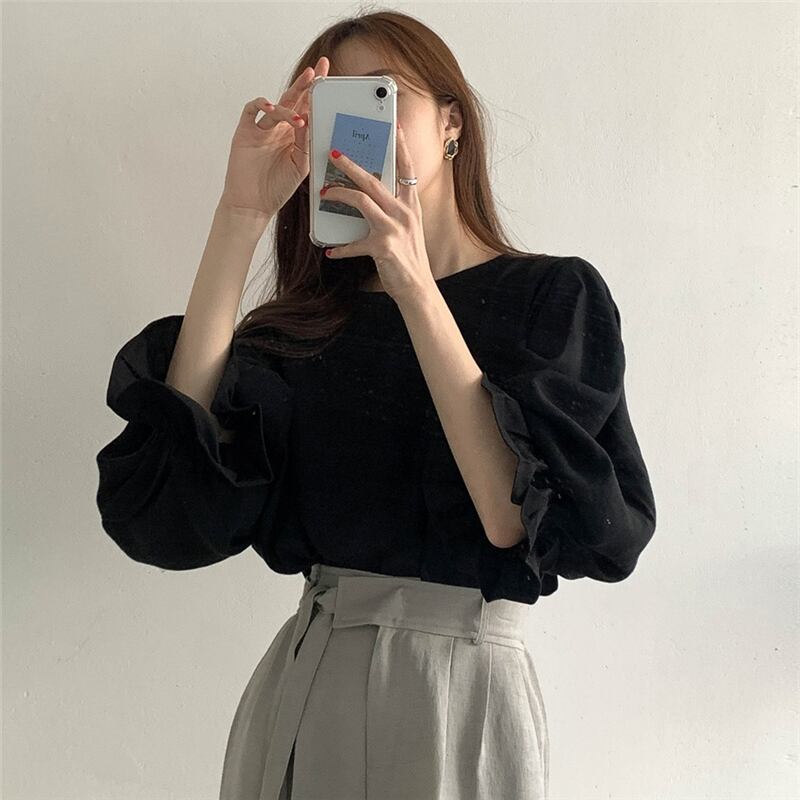 長袖ブラウス トップス ブラウス 袖あり 長袖 パフスリーブ ラウンドネック 綿 かわいい 大人可愛い きれいめ シンプル カジュアル 大人 上品 おしゃれ お洒落 大人可愛い 大人女子 こなれ感 キュート ガーリー モダン 主役級 存在感 無地 春 秋 10代 20代 30代 レディース OL 通勤 学生 通学 デート お出かけ 女子会 休日 着回し 普段使い 重ね着 韓国系 オルチャン サイズ S M 色展開 白 ホワイト 黒 ブラック