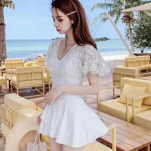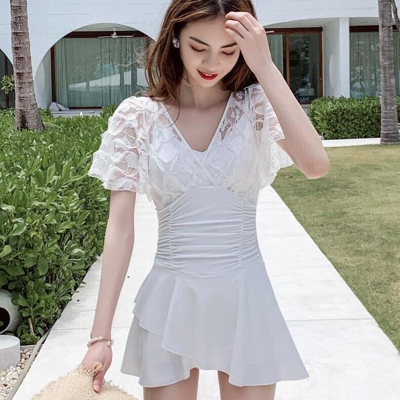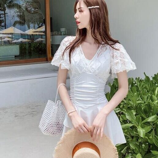 ワンピース 水着 ショート丈 半袖 パフスリーブ Vネック スリム Aライン フリル 切り替えデザイン 透け感 かわいい 大人可愛い きれいめ 上品 おしゃれ 大人女子 ラブリー キュート セクシー エレガント 存在感 無地 夏 10代 20代 30代 レディース デート 休日 イベント リゾート 海 プール オルチャン コーデ モテ 美脚 脚長 インスタ映え サイズ M L XL 2XL 色展開 ホワイト ブラック