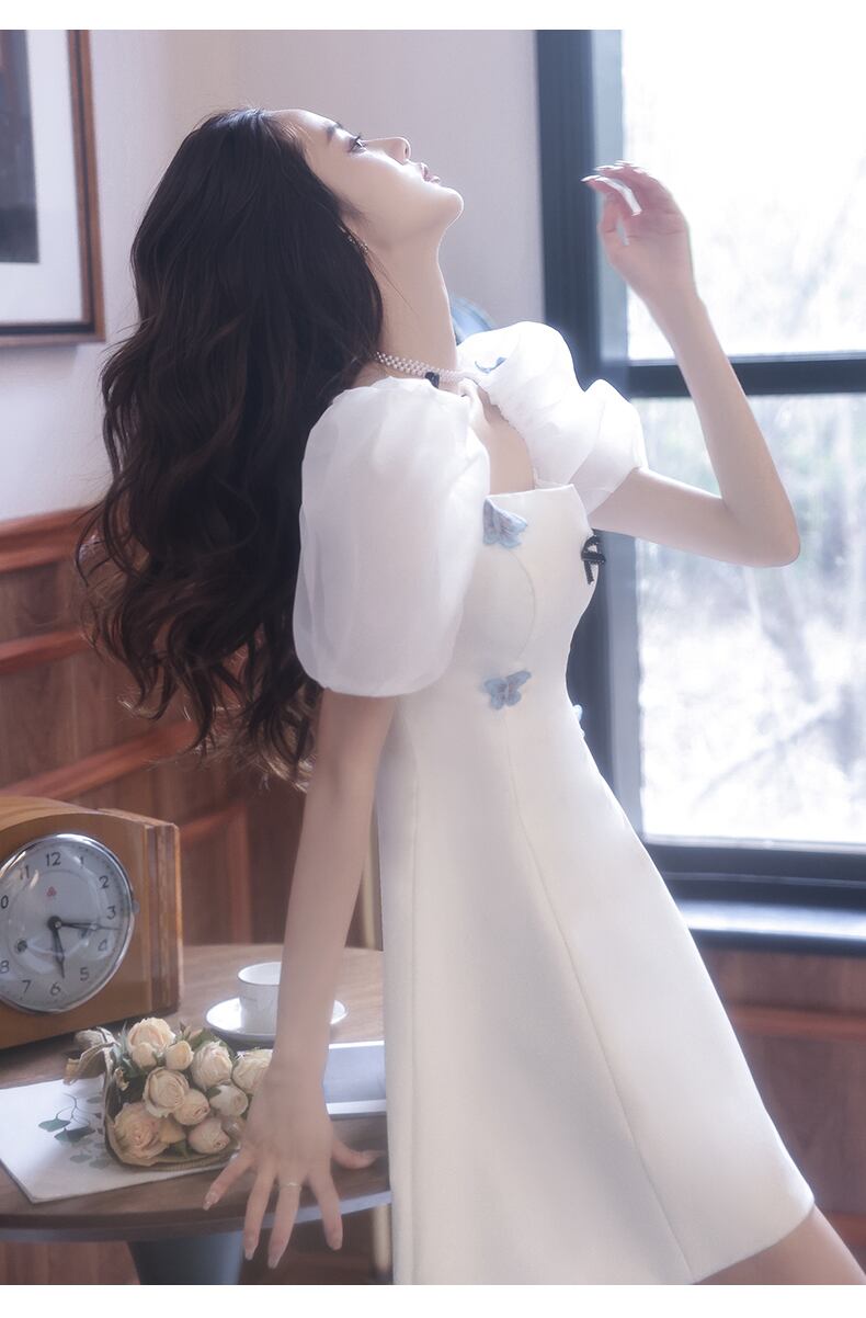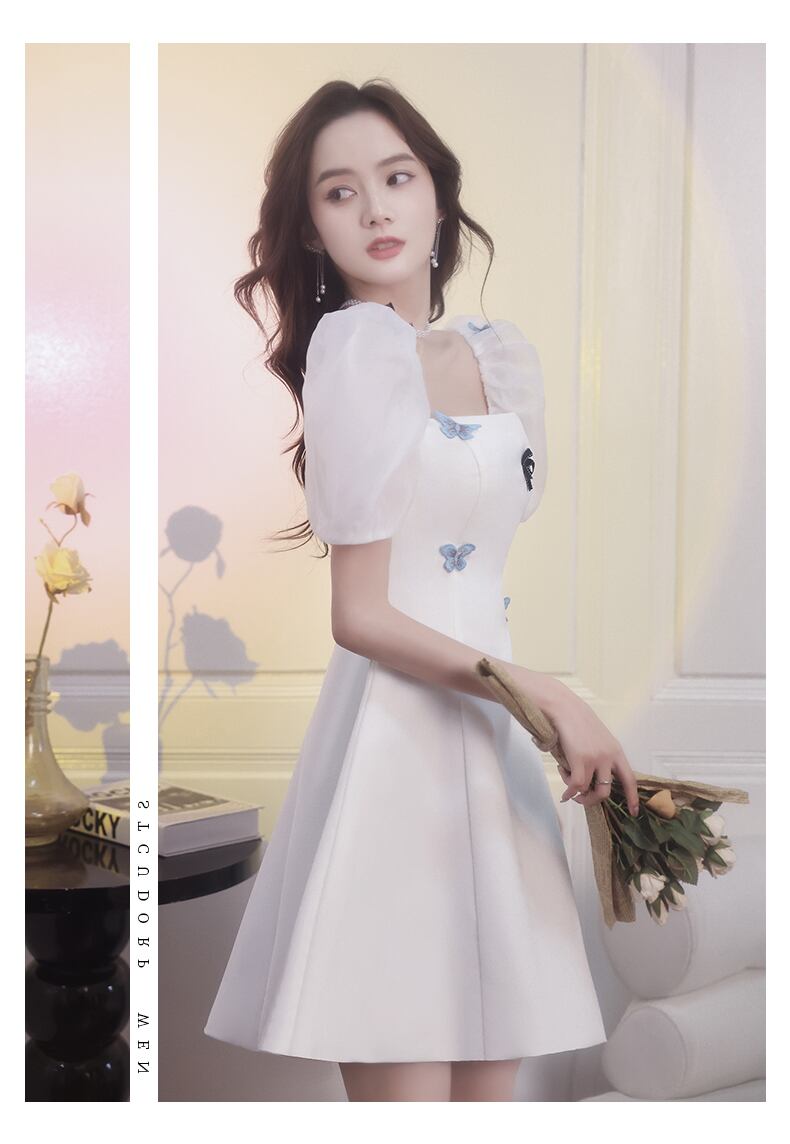 ドレス dress ワンピース パーティードレス ショート丈 膝上 袖あり 半袖 ボリューム袖 スクエアネック オフショルダー オフショル Aライン リボン ハイウエスト 透け感 かわいい シンプル レトロ キュート 存在感 無地 10代 20代 レディース 女性用 パーティー イベント 春 夏 二次会 お呼ばれ S M L XL 2XL 白 ホワイト