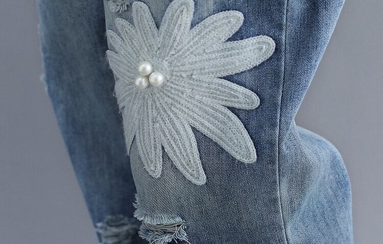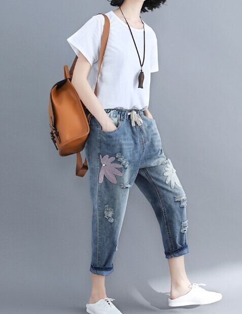 大きなお花の刺繍と、ダメージ加工がポイント。体型カバーをしてくれる、ルーズなシルエットが◎動きやすいアンクル丈は、アウトドアや運動におすすめです。人とかぶらない、個性的なデザインがおしゃれさを演出します。