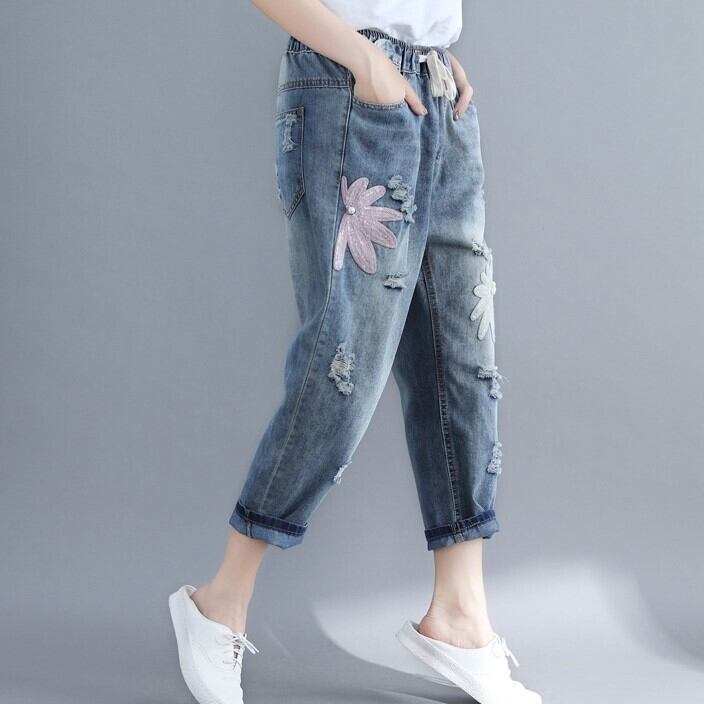 ボトムス パンツ アンクル丈 ストレート ワイド 刺繍 ポケット ハイウエスト ウエストゴム ブルーデニム 大人可愛い カジュアル 上品 おしゃれ かっこいい 大人女子 こなれ感 ラフ ルーズ 個性的 存在感 抜け感 ダメージ加工 フラワー 春 夏 20代 30代 40代 レディース お出かけ 公園デビュー 休日 アウトドア 旅行 着回し 普段使い 韓国系 ファッション 楽ちん 体系カバー 定番 インスタ映え サイズ M L XL 2XL 3XL 4XL 色展開 ブルー