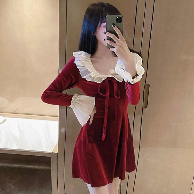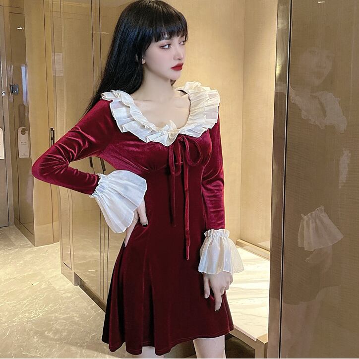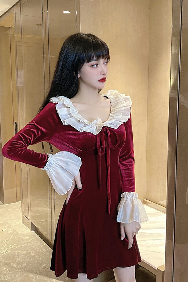 ワンピース ドレス ミニ丈 袖あり 長袖 フレアスリーブ 襟付き フリル襟 Aライン プリーツ リボン ハイウエスト 大人可愛い きれいめ 上品 おしゃれ 大人女子 ラブリー キュート エレガント モダン 主役級 無地 秋 冬 誕生日 披露宴 ハロウィン クリスマス バレンタイン 10代 20代 レディース デート お出かけ 女子会 休日 パーティー イベント ホテル レストラン 着回し 普段使い オルチャン ファッション モテ 美脚 脚長 インスタ映え サイズ S M L 色展開 ワインレッド