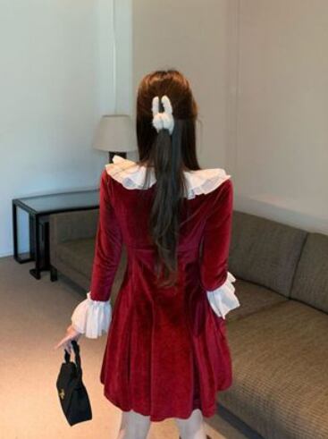 秋冬のイベントで活躍する、上品で愛らしいドレスワンピ。襟元と袖にフリルがあって、胸元のリボンもキュートな印象です。秋冬シーズンに似合う、ワインレッドは程よく存在感を主張してくれます。コーデのバランスが良く見える、ロングブーツスタイルがおすすめです。