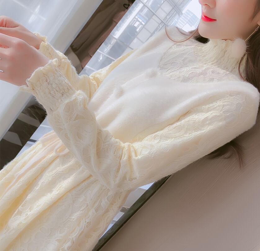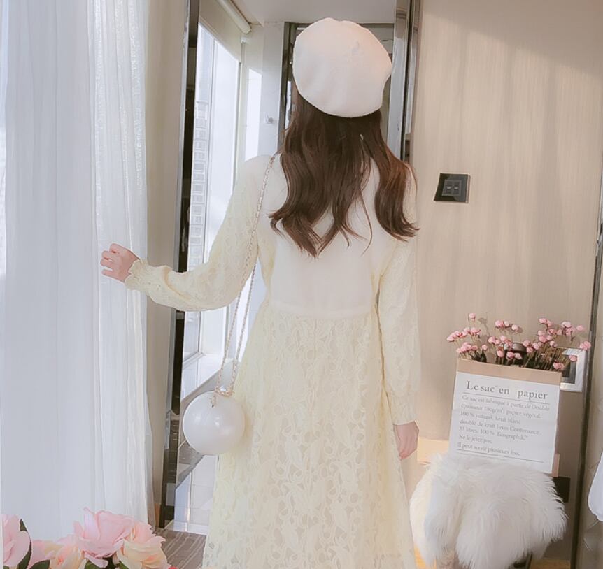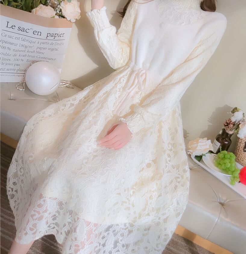 ワンピース ミモレ丈 袖あり 長袖 スタンドカラー Aライン レース ウエストリボン ふわふわ ハイウエスト かわいい シンプル ガーリー 存在感 無地 秋 冬 10代 20代 30代 レディース 女性用 デート お出かけ 女子会 休日 着回し 普段使い 重ね着 楽ちん モテ S M L XL アプリコット