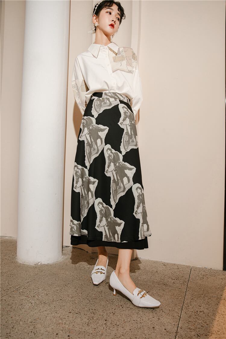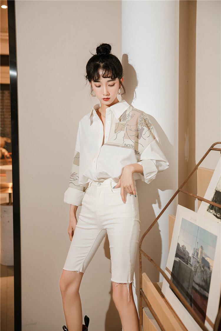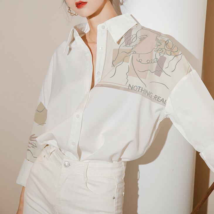 肩と腕にプリントされたアシンメトリーデザインがおしゃれな長袖ブラウスです。