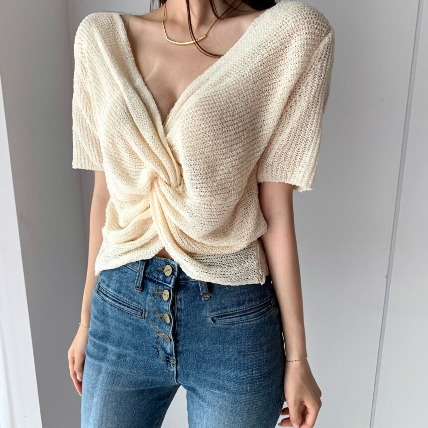 ざっくり編み&クロスデザインが夏っぽいトップスです。