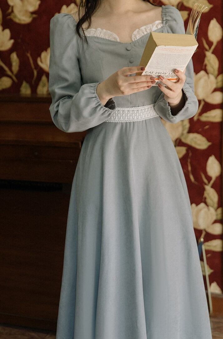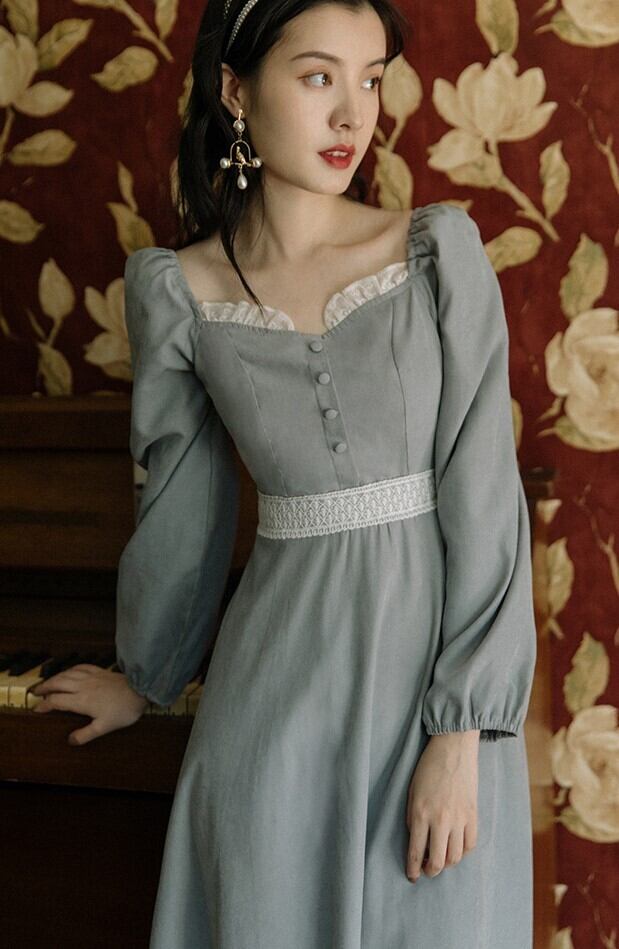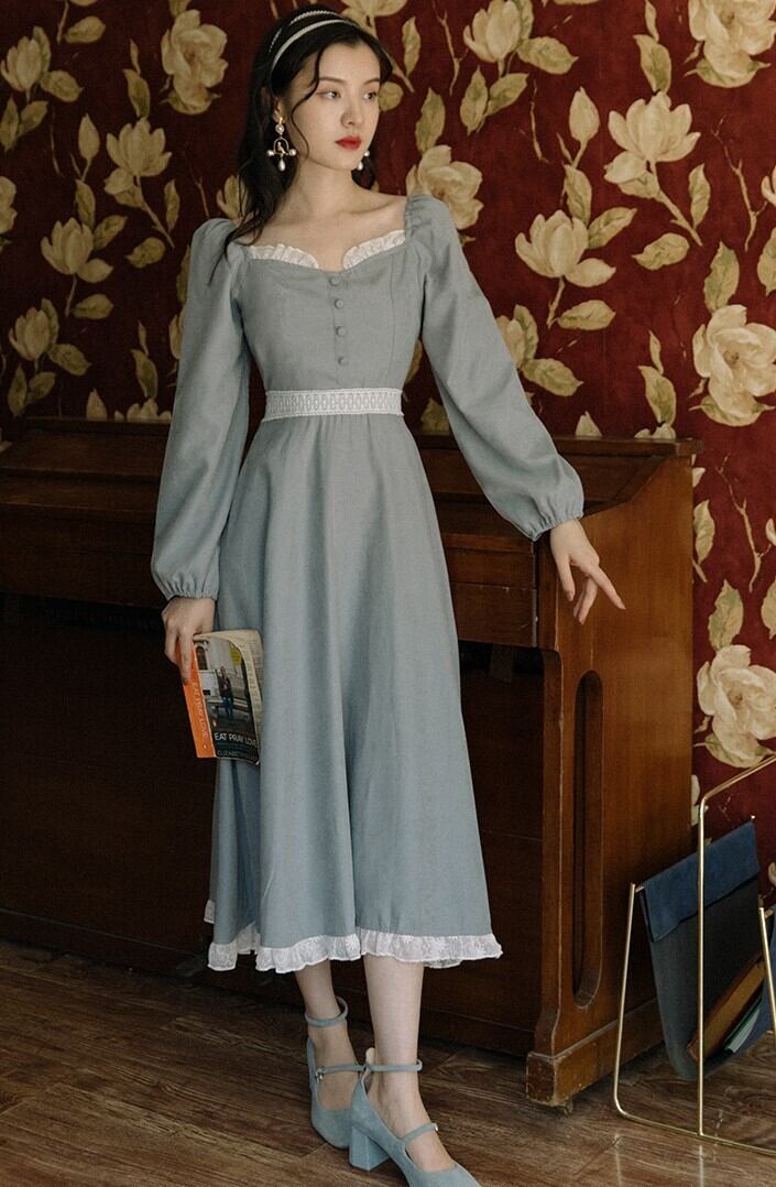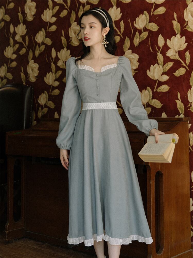 ワンピース ドレス シャツワンピース ロング丈 袖あり 長袖 パフスリーブ スクエアネック Aライン フリル ハイウエスト 大人可愛い きれいめ 上品 おしゃれ 大人女子 こなれ感 ラブリー キュート エレガント 主役級 無地 春 秋 2022 10代 20代 レディース デート お出かけ 休日 パーティー イベント ホテル レストラン 着回し 普段使い モテ 新作 インスタ映え フレンチスタイル サイズ S M L XL 色展開 ライトブルー