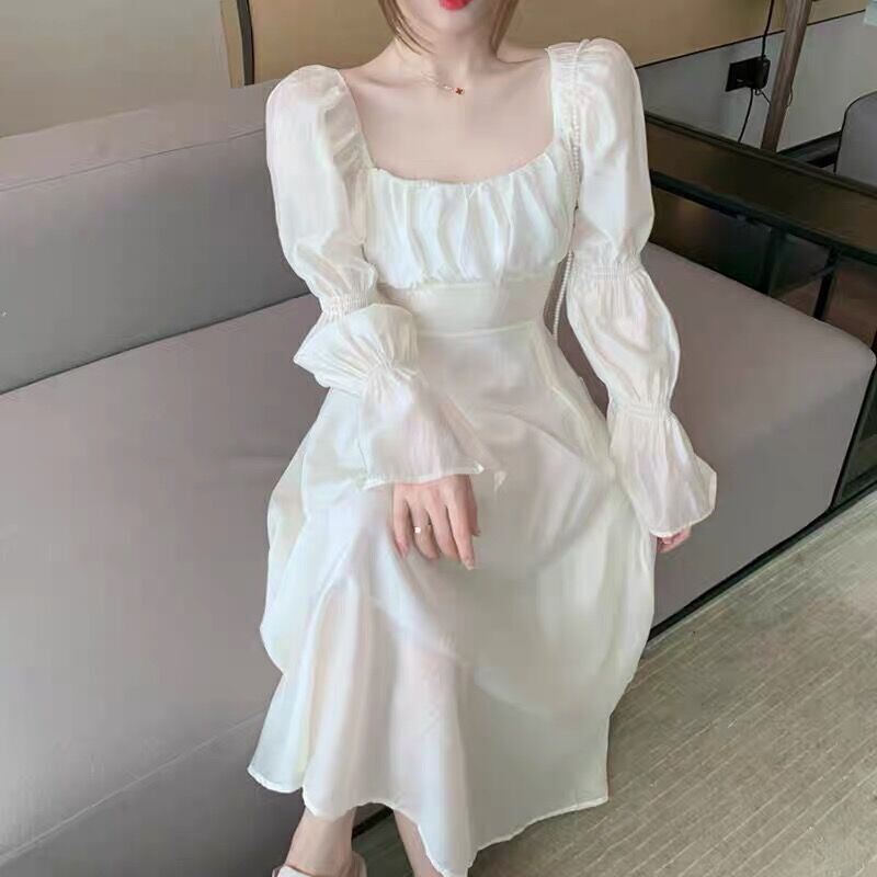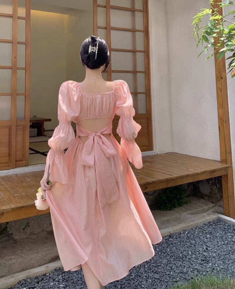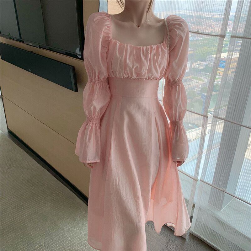 ワンピース ドレス ミモレ丈 袖あり 長袖 キャンディスリーブ スクエアネック ストレート プリーツ ウエストマーク ハイウエスト バックボtン 背中開き 大人可愛い きれいめ 上品 おしゃれ 大人女子 ラブリー キュート セクシー エレガント 主役級 存在感 とろみ感 無地 春 秋 誕生日 二次会 2021 10代 20代 30代 レディース デート お出かけ 休日 パーティー イベント ホテル レストラン モテ 美脚 脚長 インスタ映え フレンチスタイル S M L XL ピンク アプリコット