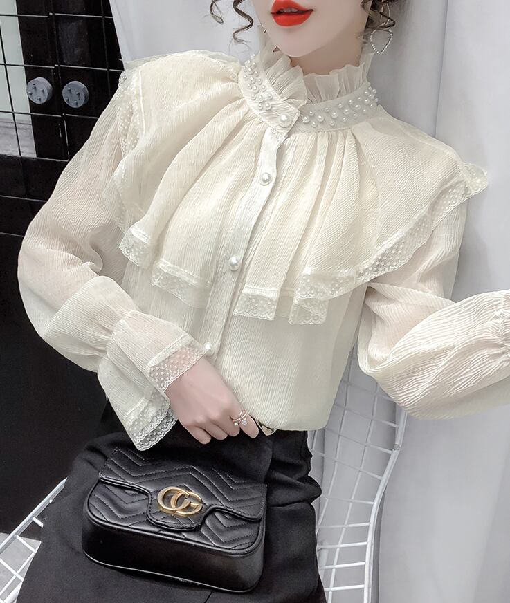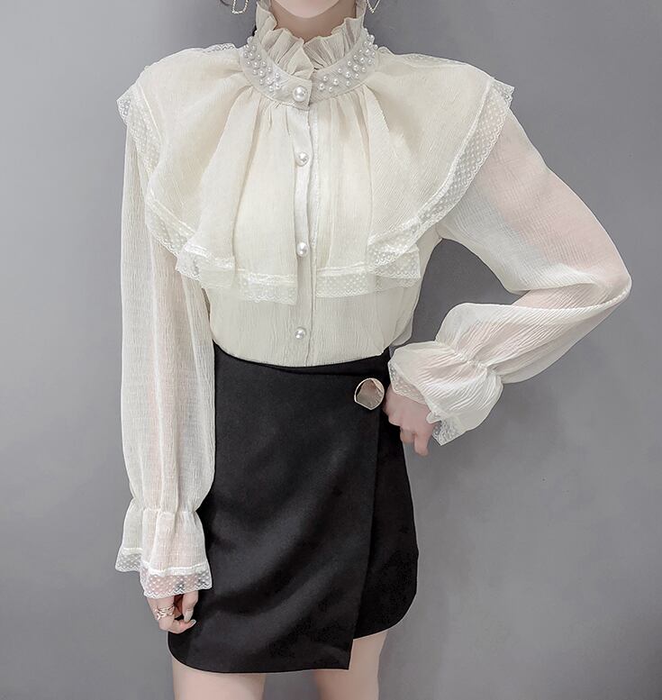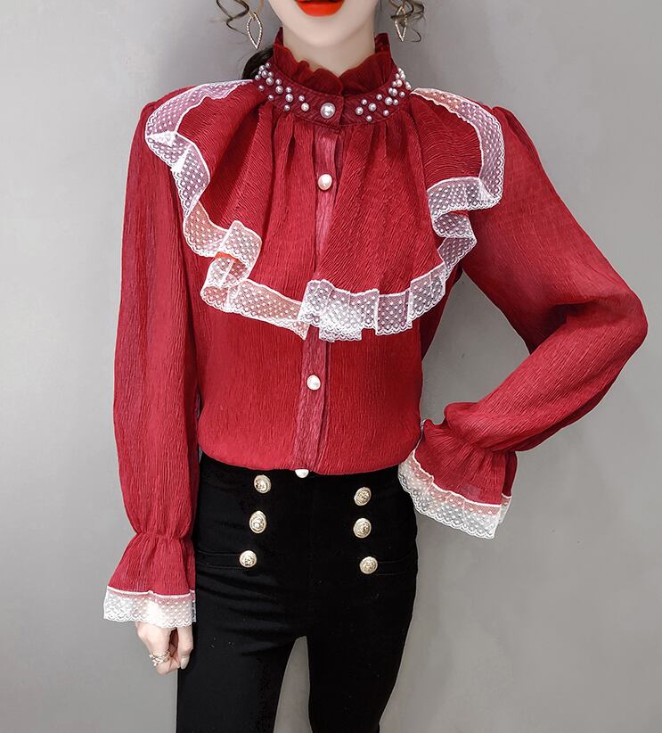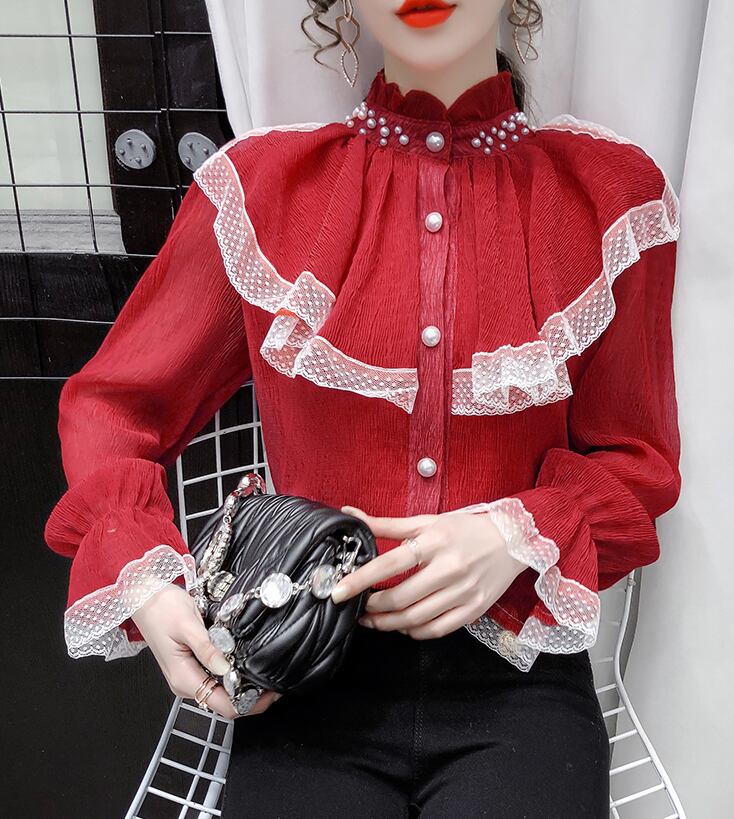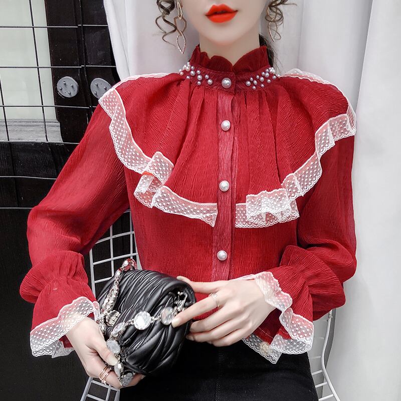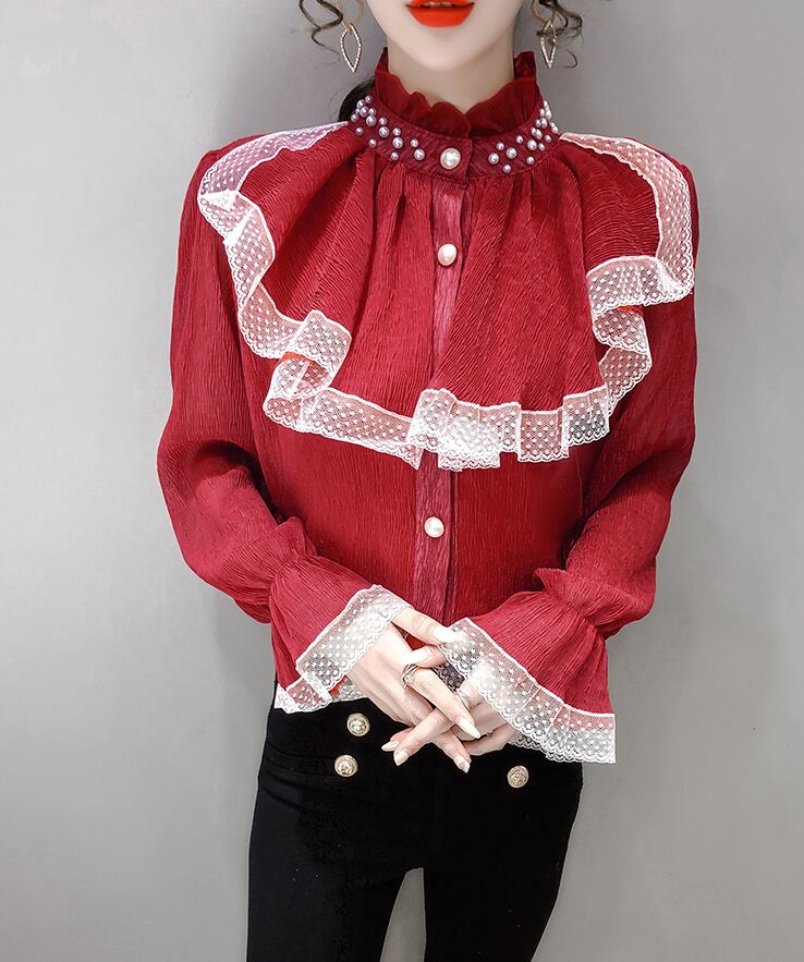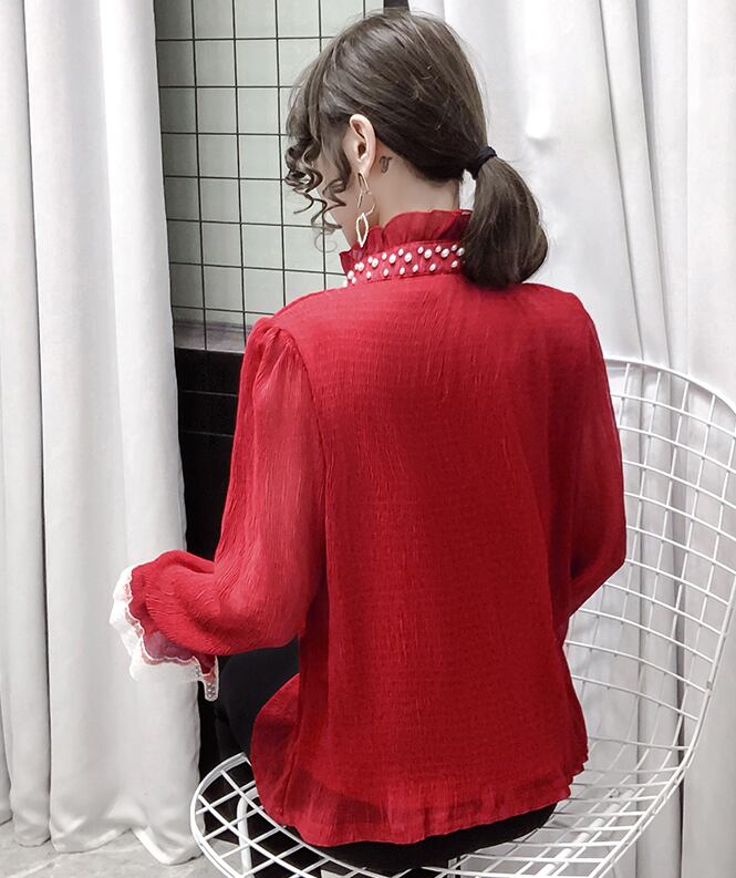 レースフリルブラウス トップス ブラウス 袖あり 長袖 ハイネック レース フリル 前開き かわいい 大人可愛い きれいめ シンプル カジュアル 大人 上品 おしゃれ お洒落 大人可愛い 大人女子 こなれ感 ラフ 個性的 モダン 主役級 存在感 無地 春 秋 10代 20代 30代 レディース OL 通勤 学生 通学 デート お出かけ 女子会 休日 着回し 普段使い 重ね着 韓国系 オルチャン サイズ S M L XL 色展開 赤 レッド アプリコット