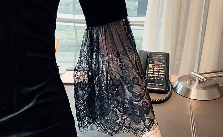 レースフレア袖切替、光沢感で大人上品な印象に。