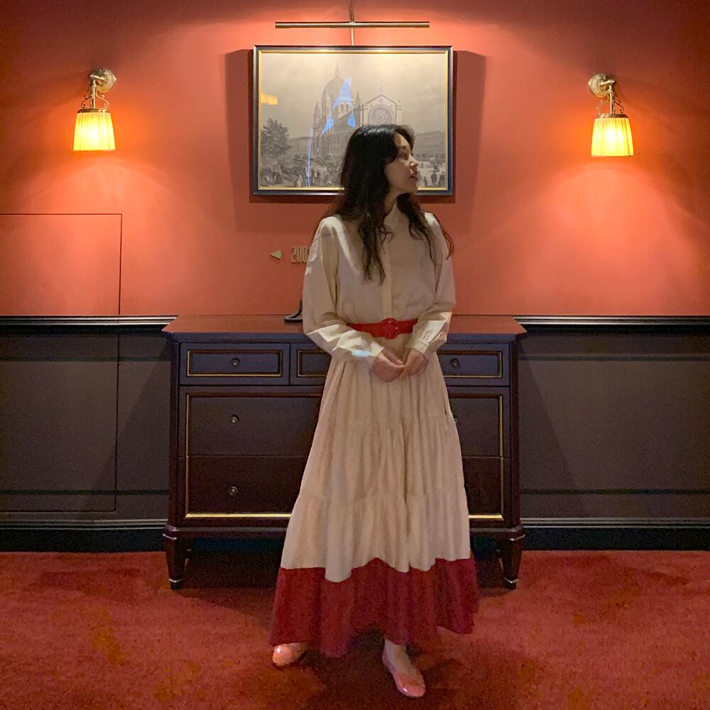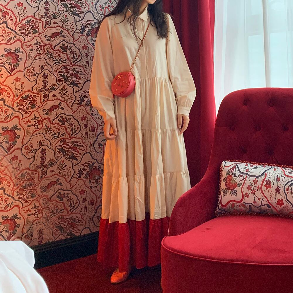 ティアード ワンピース シャツワンピース ロング丈 袖あり 長袖 襟付き Aライン 切り替えデザイン カジュアル おしゃれ お洒落 こなれ感 存在感 無地 春 夏 秋 10代 20代 30代 40代 レディース 女性用 ママ マタニティ デート お出かけ 女子会 休日 着回し 普段使い 重ね着 楽ちん フリーサイズ 青 ブルー バイカラー アプリコット