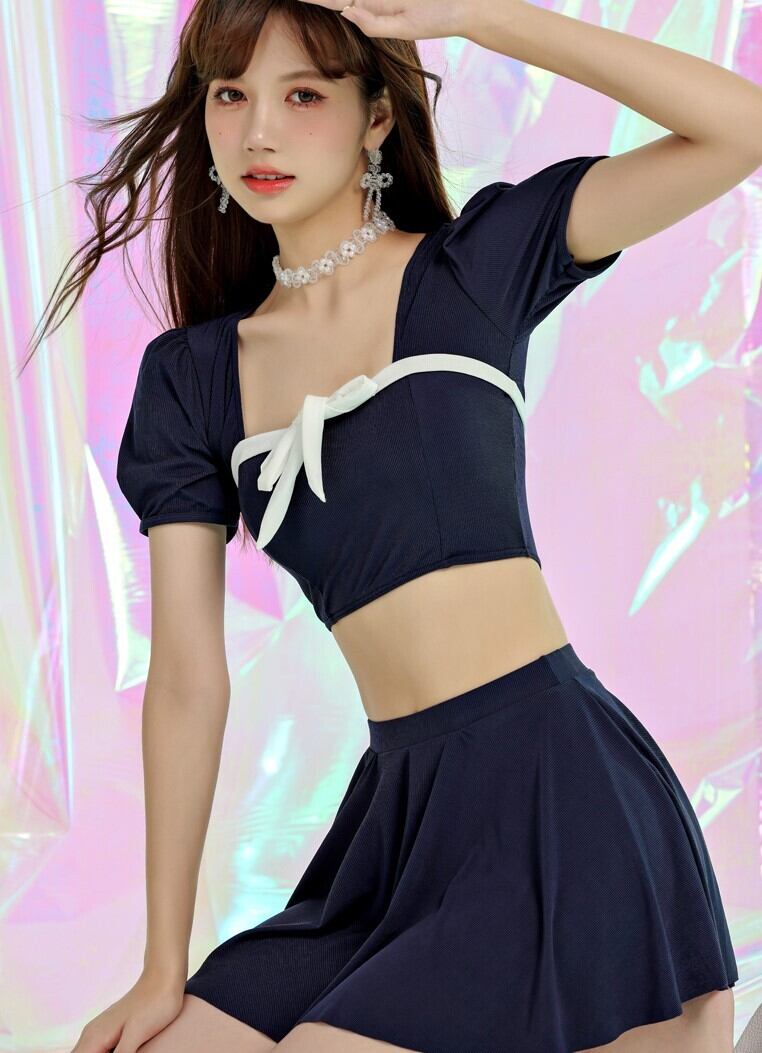 セットアップ 水着 ショート丈 袖あり 半袖 パフスリーブ スクエアネック スリム Aライン プリーツ 3点セット 大人可愛い おしゃれ レトロ こなれ感 ラブリー キュート ガーリー セクシー 主役級 無地 春 夏 2022 10代 20代 レディース デート 休日 リゾート 海 プール 着回し モテ 美脚 脚長 新作 サイズ M L XL 色展開 ネイビー