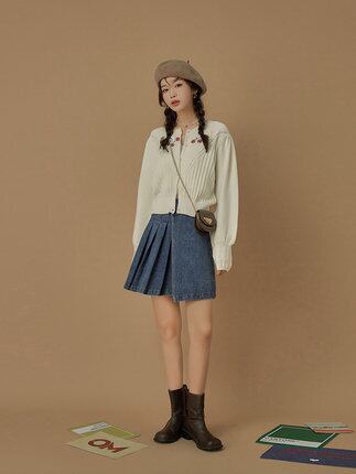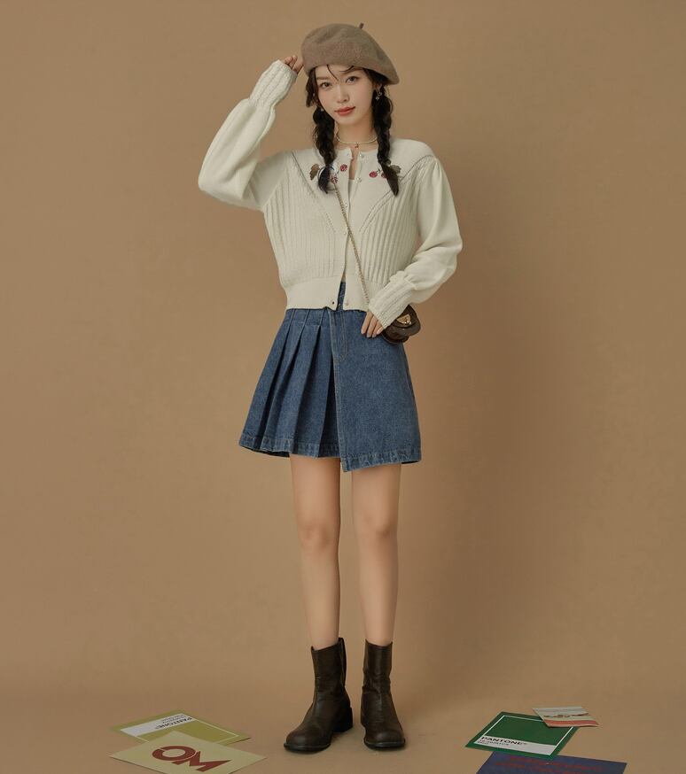 シンプルなデニムやスカートと合わせてチェリーカーディガンを主役にするコーディネートもおすすめ。