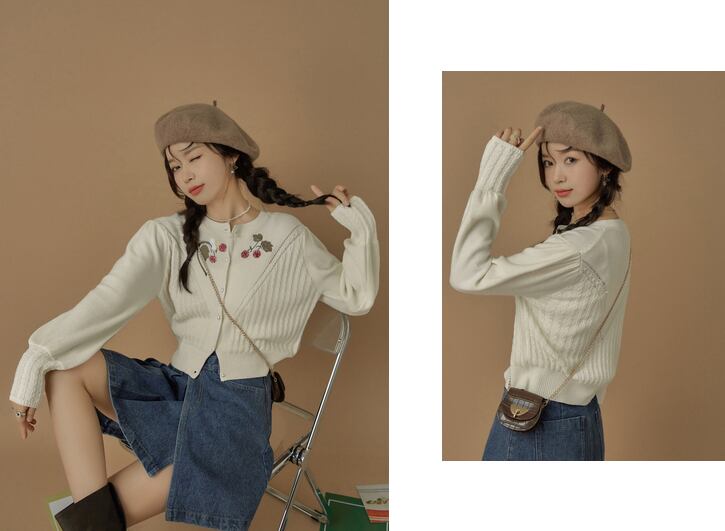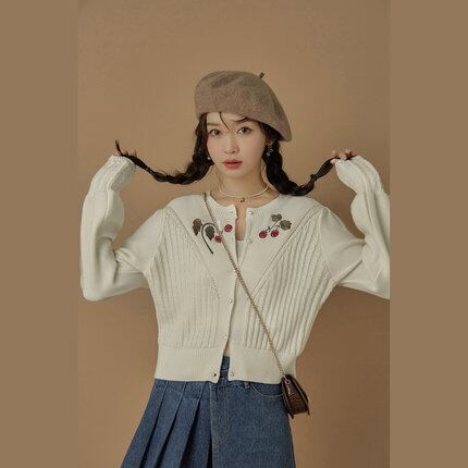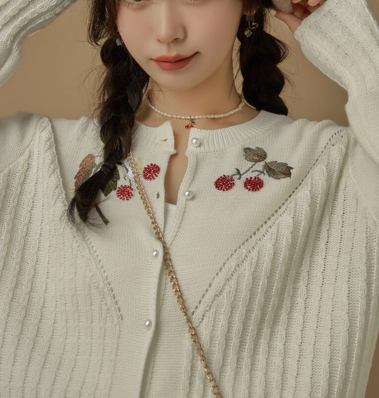 新しいおしゃれにトライしたくなるチェリーモチーフのニットカーディガン。