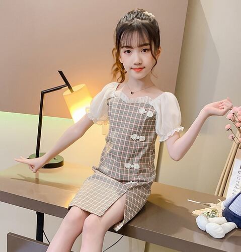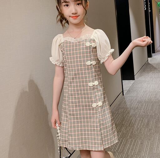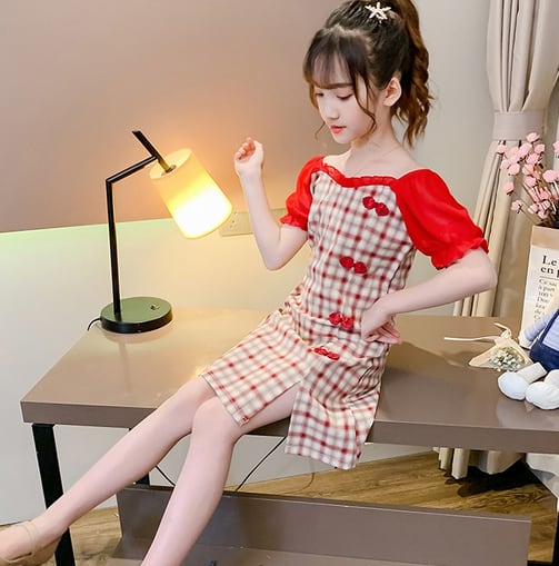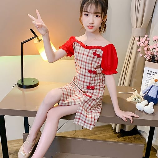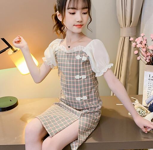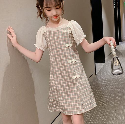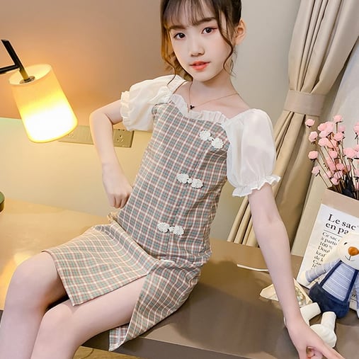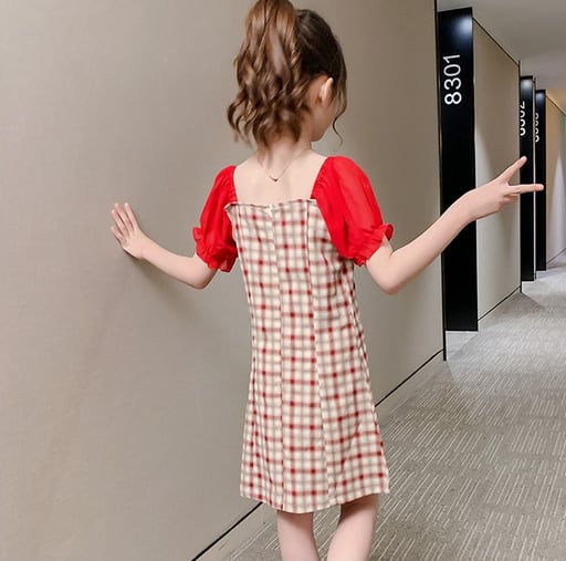 ワンピース ドレス 膝上 袖あり 半袖 パフスリーブ スクエアネック ストレート フリル サイドスリット ドッキング 透け感 かわいい 上品 おしゃれ ラブリー キュート ガーリー 存在感 とろみ感 チェック柄 春 夏 2021 キッズ 女の子 パーティー イベント レストラン 着回し 普段使い オルチャン 美脚 脚長 インスタ映え サイズ展開豊富 色展開 ライトグリーン レッド