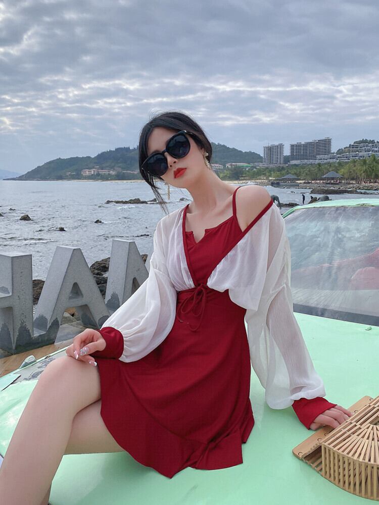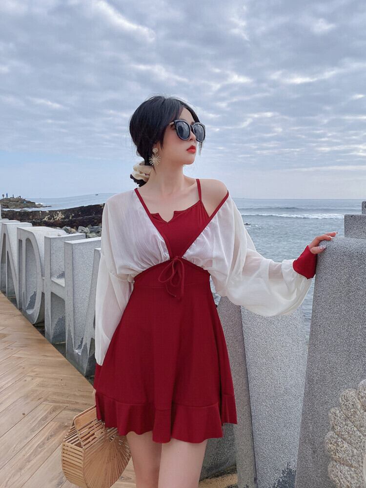 水着 ワンピース水着 体系カバー 長袖 ハイウエスト 透け感 盛れる 紫外線対策 2点セット ツーピース かわいい 大人可愛い ナチュラル 華やか おしゃれ 存在感 ラブリー キュート 無地 10代 20代 30代 レディース 二の腕カバー 美脚 着痩せ スタイルアップ オルチャン 新作 インスタ映え サイズ S M L XL 色展開 ブラック レッド