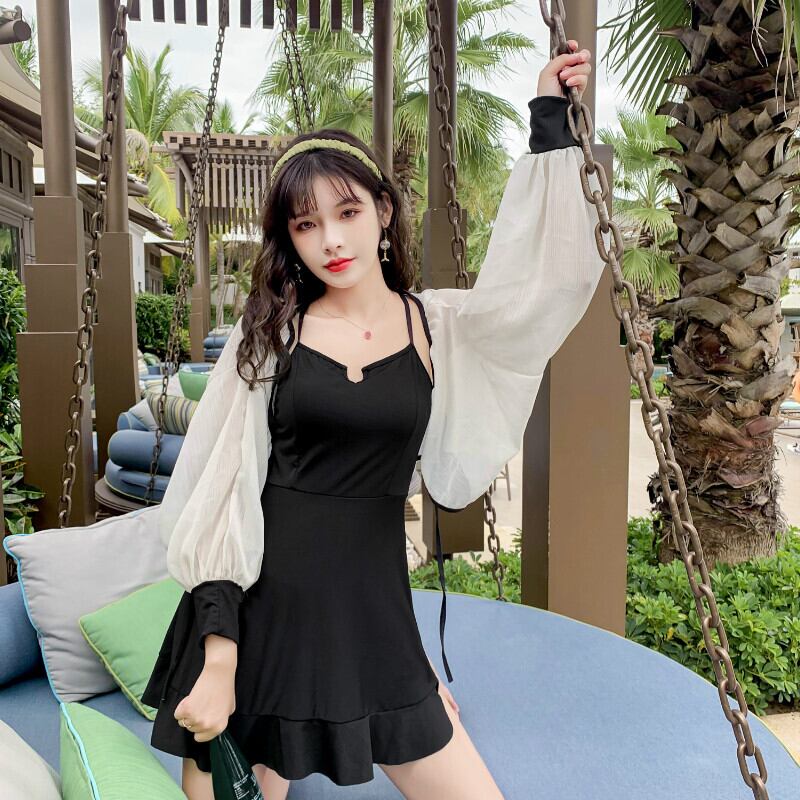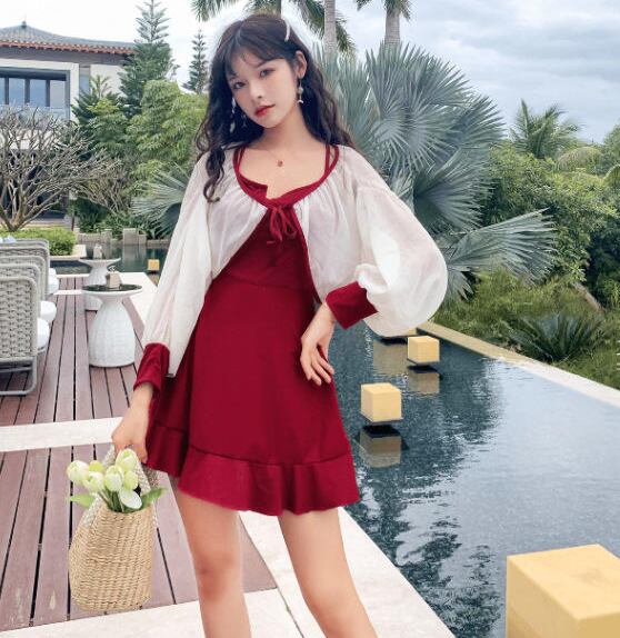 ワンピースタイプで、可愛く着こなせます。ふんわり袖の羽織がセットで、紫外線対策にも役立ちますよ。ボディラインを引き締めてくれるカラーは、嬉しい着やせ効果UP。ビーチもプールにも、1着あれば夏のレジャーに着回しが出来ます。