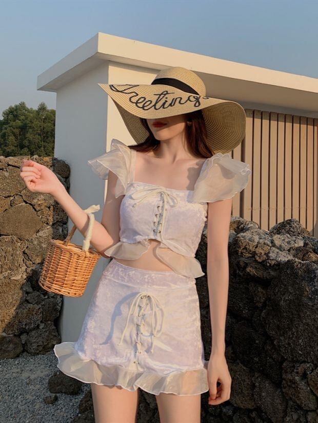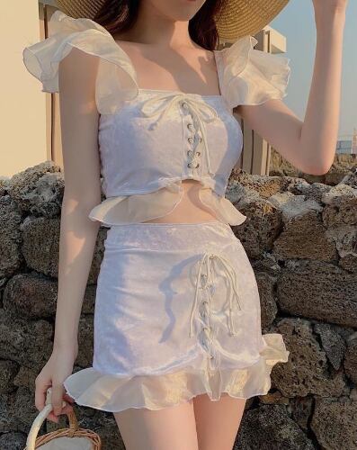 水着 タンキニ 体系カバー水着 セパレート 体系カバー 二の腕カバー フリル レースアップ ハイウエスト 盛れる 上下セット かわいい 大人可愛い きれいめ 華やか おしゃれ ラブリー キュート ガーリー 個性的 無地 10代 20代 レディース 美脚 脚長 美スタイル オルチャン 高見え モテ インスタ映え サイズ M L XL 色展開 ホワイト