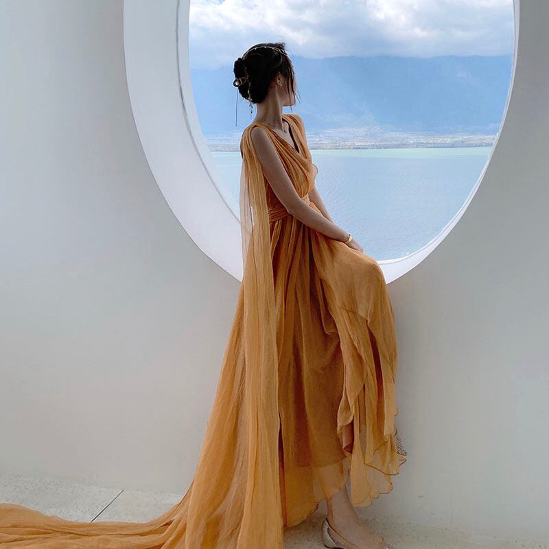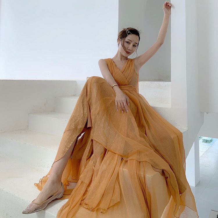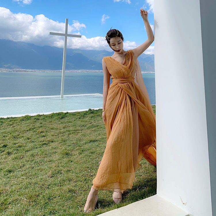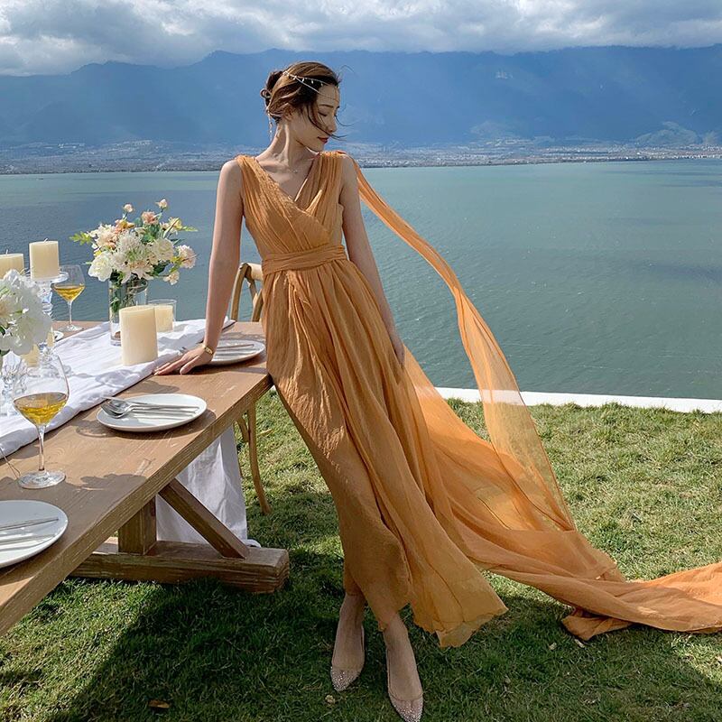 Vネックシフォンワンピース ワンピース フレアワンピース ロング ロング丈 マキシ マキシ丈 袖なし ノースリーブ Vネック カシュクール フレア シフォン ウエストマーク ハイウエスト 透け感 ポリエステル かわいい 大人可愛い きれいめ シンプル カジュアル 大人 上品 おしゃれ お洒落 レトロ エキゾチック 大人女子 こなれ感 キュート ガーリー 個性的 モダン 主役級 存在感 無地 春 夏 秋 10代 20代 30代 レディース デート お出かけ 女子会 休日 パーティー イベント 着回し