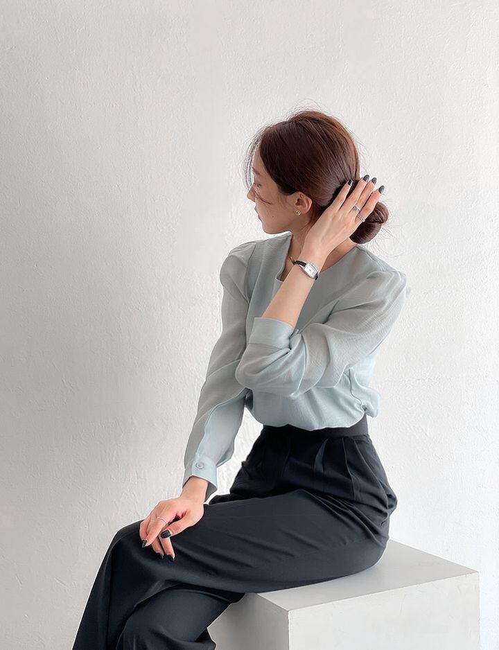 程よく光沢感のある上品な印象のブラウス。