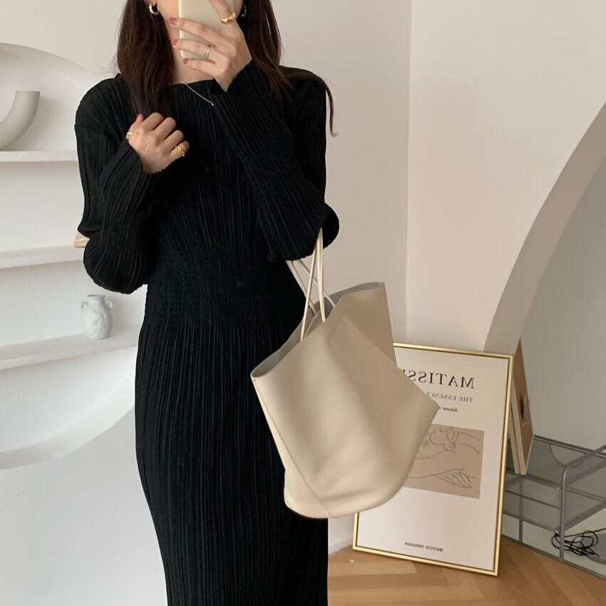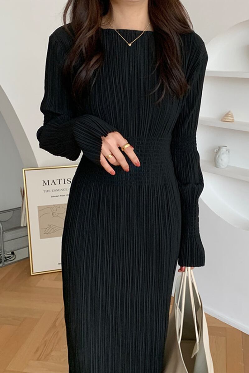 プリーツワンピース ワンピース ワンピドレス ミモレ ミモレ丈 ロング ロング丈 袖あり 長袖 ラウンドネック プリーツ ウエストマーク ハイウエスト かわいい 大人可愛い きれいめ シンプル カジュアル 大人 上品 おしゃれ お洒落 レトロ エキゾチック 大人女子 こなれ感 キュート ガーリー 個性的 セクシー モダン 主役級 存在感 無地 春 秋 10代 20代 30代 レディース OL 通勤 学生 通学 デート お出かけ 女子会 休日 着回し 普段使い 重ね着 韓国系 オルチャン 色展開 ブラック