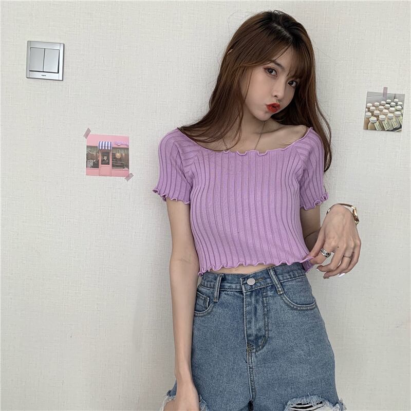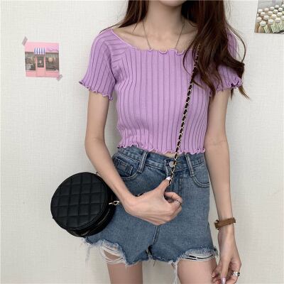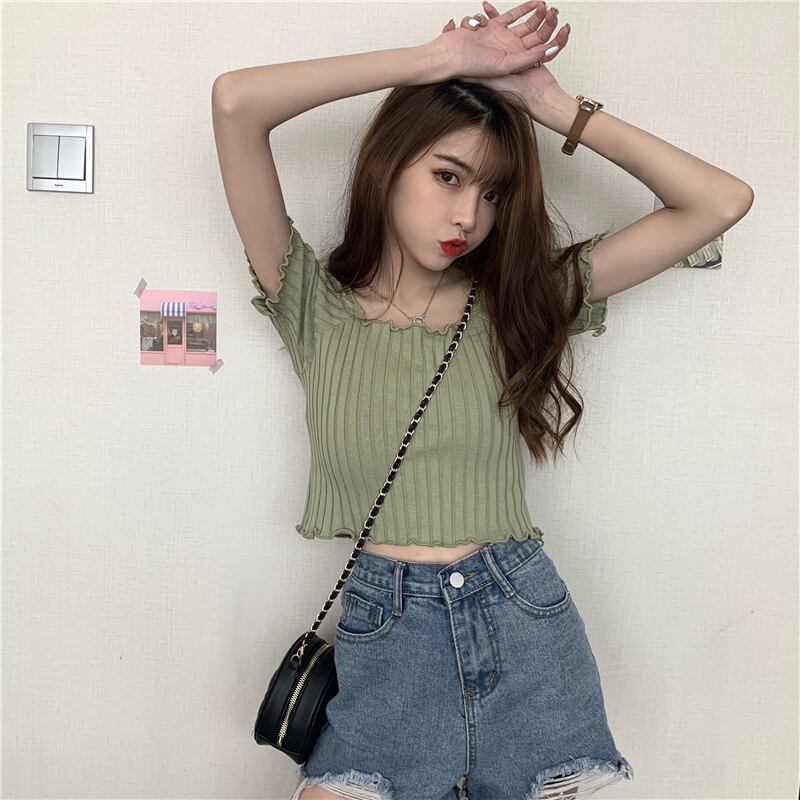 リブニット トップス ニットソー セーター ショート ショート丈 袖あり 半袖 ラウンドネック フリル かわいい 大人可愛い きれいめ シンプル カジュアル 大人 上品 おしゃれ お洒落 レトロ 大人女子 こなれ感 キュート ガーリー 個性的 セクシー モダン 主役級 存在感 無地 春 夏 10代 20代 30代 レディース OL 通勤 学生 通学 デート お出かけ 女子会 休日 着回し 普段使い 重ね着 韓国系 オルチャン 色展開 白 ホワイト 黒 ブラック 青 ブルー 緑 グリーン